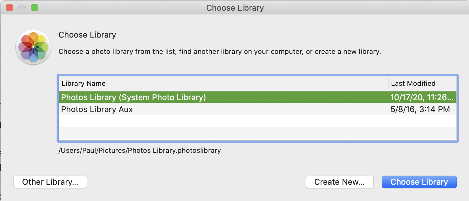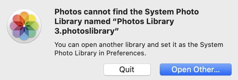 I've just switched to a new iMac (Catalina). Now Photos says "cannot find System Photo Library". My system photo library is displayed in the "Choose Library" window when I start with the option key. I've even created a new system library and Photos can't find that one either.