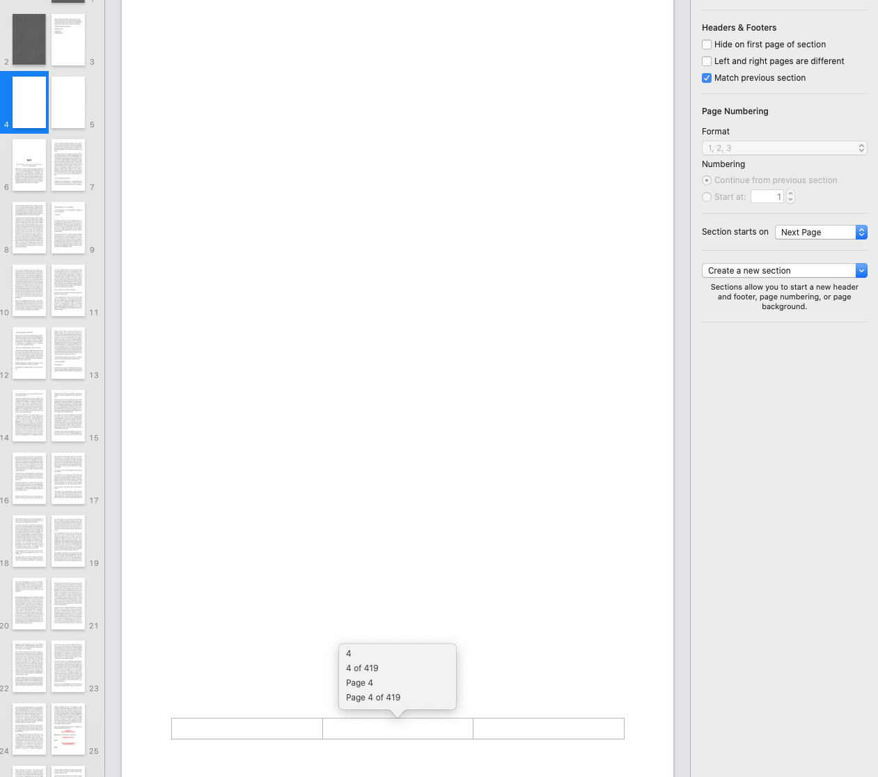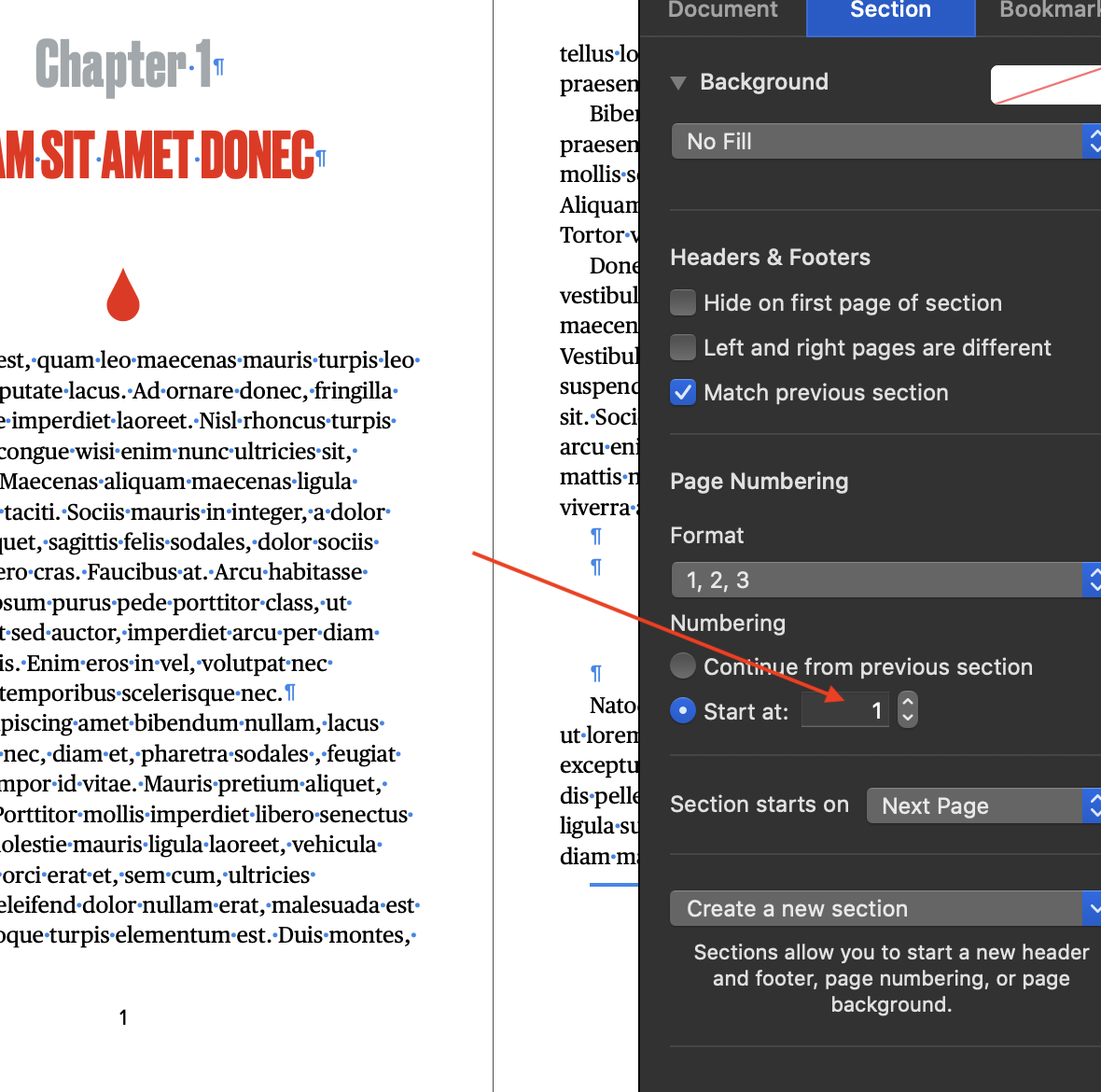 I have a book written in Pages "Edgy Novel" template. I want to start the numbered pages a few sheets in (after the title page, etc). I see stuff about "sections"that's supposed to make it easy but I can't seem to get mine to cooperate. I'm on Catalina 10.15 / Pages 10.2.