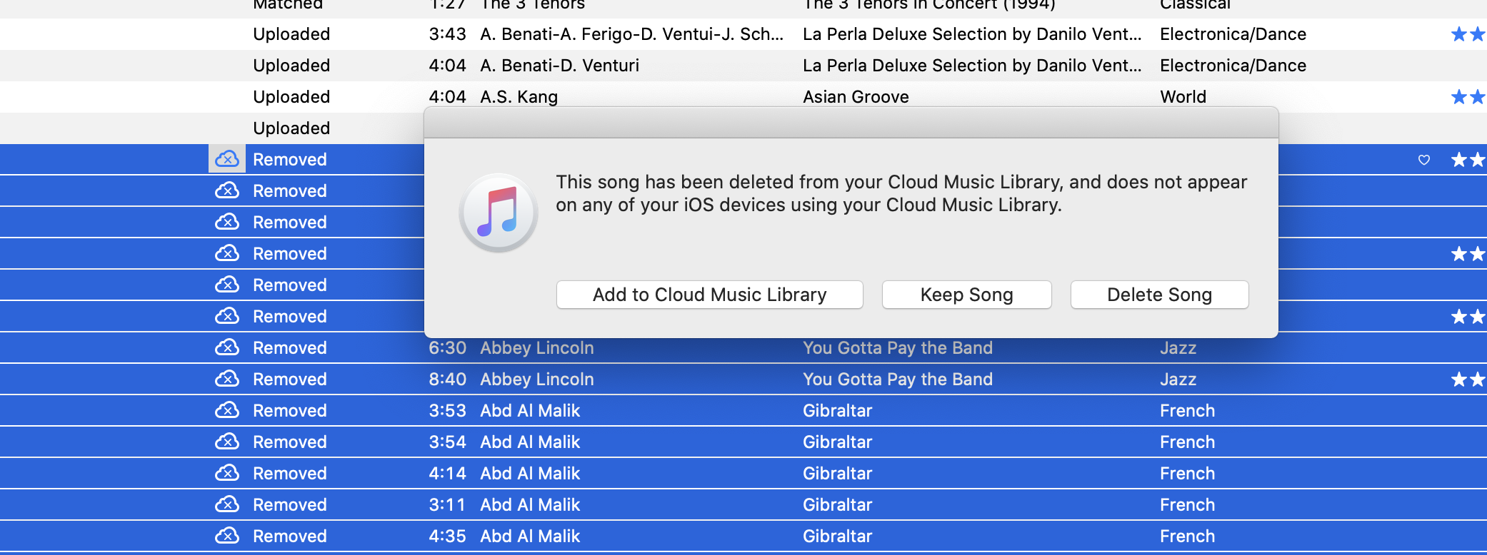 Instead I no upload took place, and all my tracks were tagged Removed (Cloud Status).