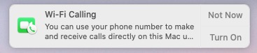 I keep getting this notification on all my devices and I can't make it stop. It says "Wi-Fi Calling. You can use your phone number to make and receive calls directly on this Mac u...". Nothing I do will make it stop. It driving me insane. I even tried turning off all FaceTime notification and it still keeps appearing.