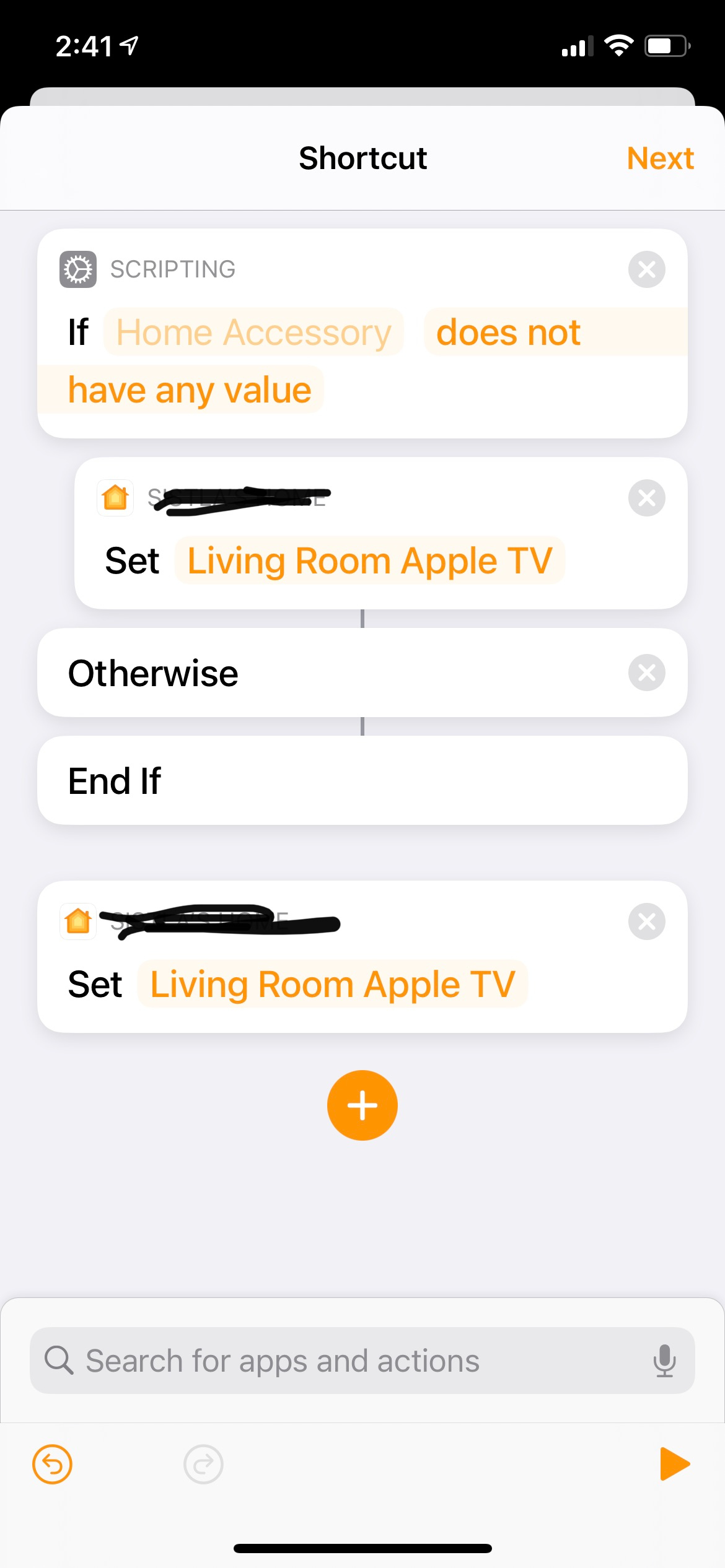 Now the problem is If Apple TV is already on, it starts playing then after 5 seconds, it again starts playing. So, I want to check if Apple TV is in sleep mode, and tried to get the state of Apple TV. this doesn't work (this works with other Accessories). I even tried conditions like, If Accessory State doesn't have a value or does have a value, but It doesn't let me select "Home Accessory" as Apple TV (again works with other Accessories). see below screenshot . Is there anyway, I can say if Apple TV is in Sleep mode, do something else do other thing?