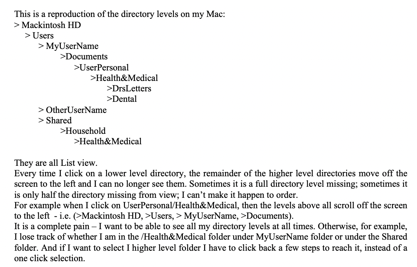 Sometimes, (and I can't reproduce it to order) the list of documents slides to the left under the sidebar, so I can no longer see the directory name I am working in.
