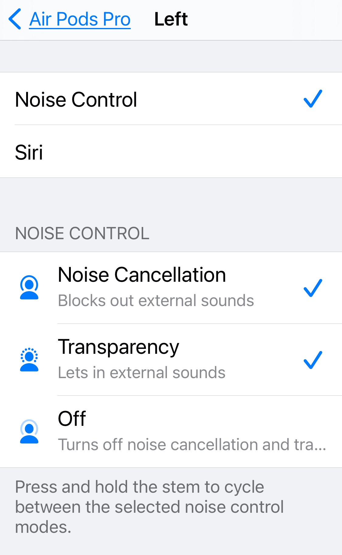 Notice at the top that a press and hold in this AirPod Pro will change "Noise Control". If you change to "Siri" the "Noise Control" choices vanish because they become irrelevant.