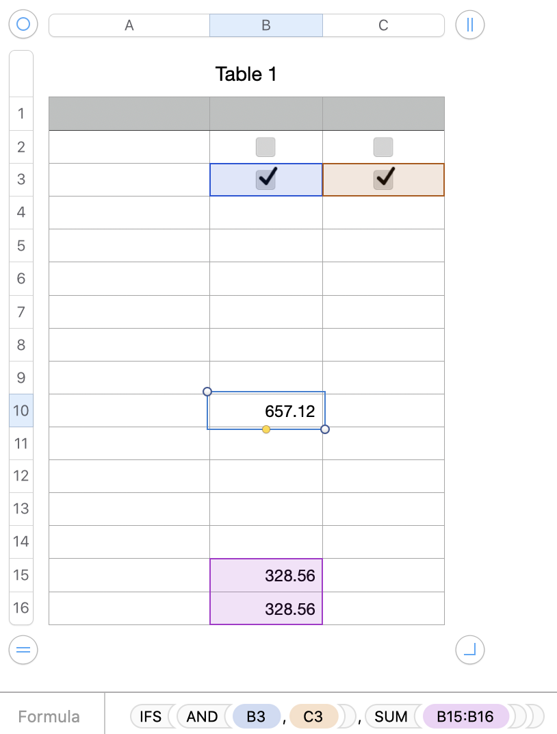 "when checkbox B3 & C3 is 'ticked', the numerical value at B10= (B15+B16). Is this possible?"