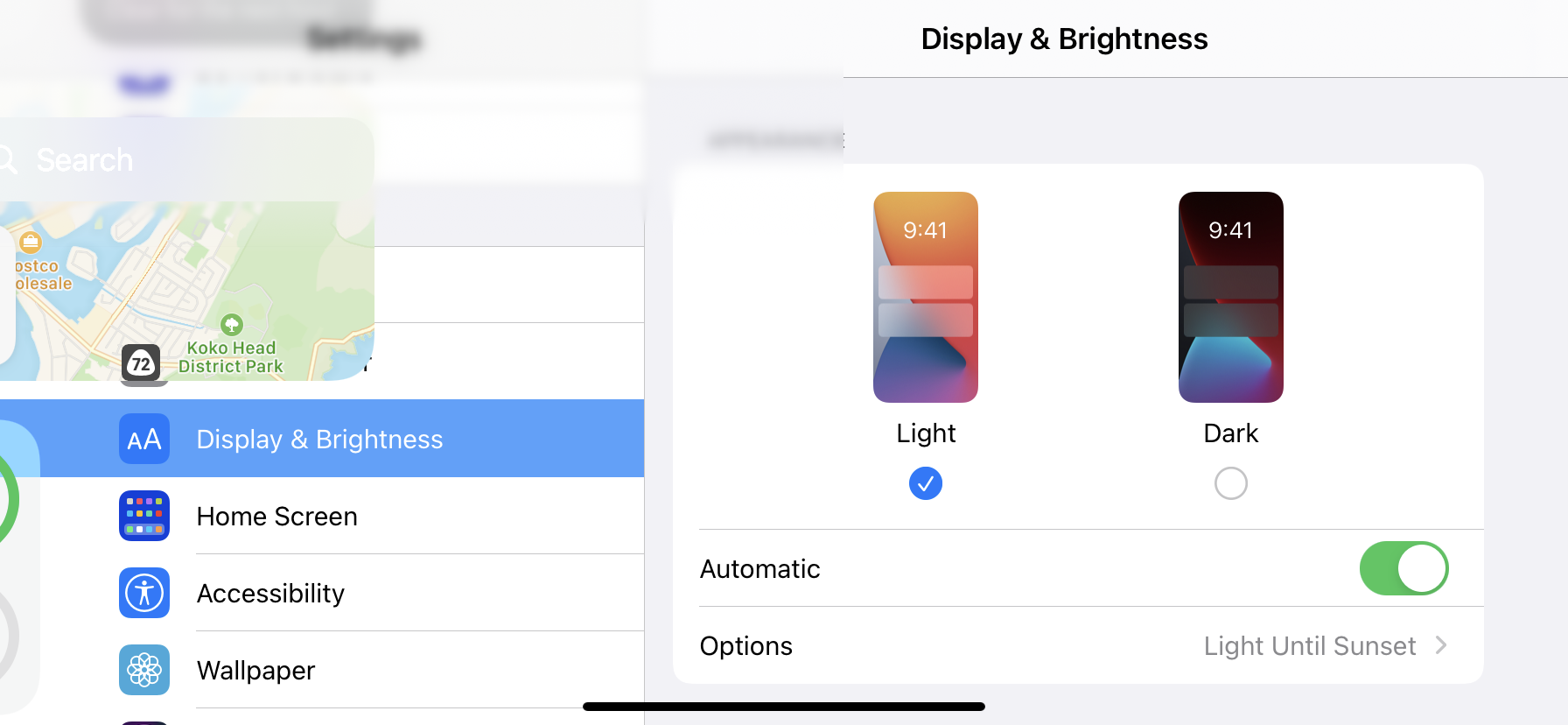 The Dark/Light mode change works temporarily for me until I go back to horizontal mode, which is how I first noticed this. Mine has a map in it with some results from Hawaii, where I wish I was. (Currently in rainy, cold Oregon.) Haven’t yet tried to restart and do the horizontal test again, but this is super annoying.