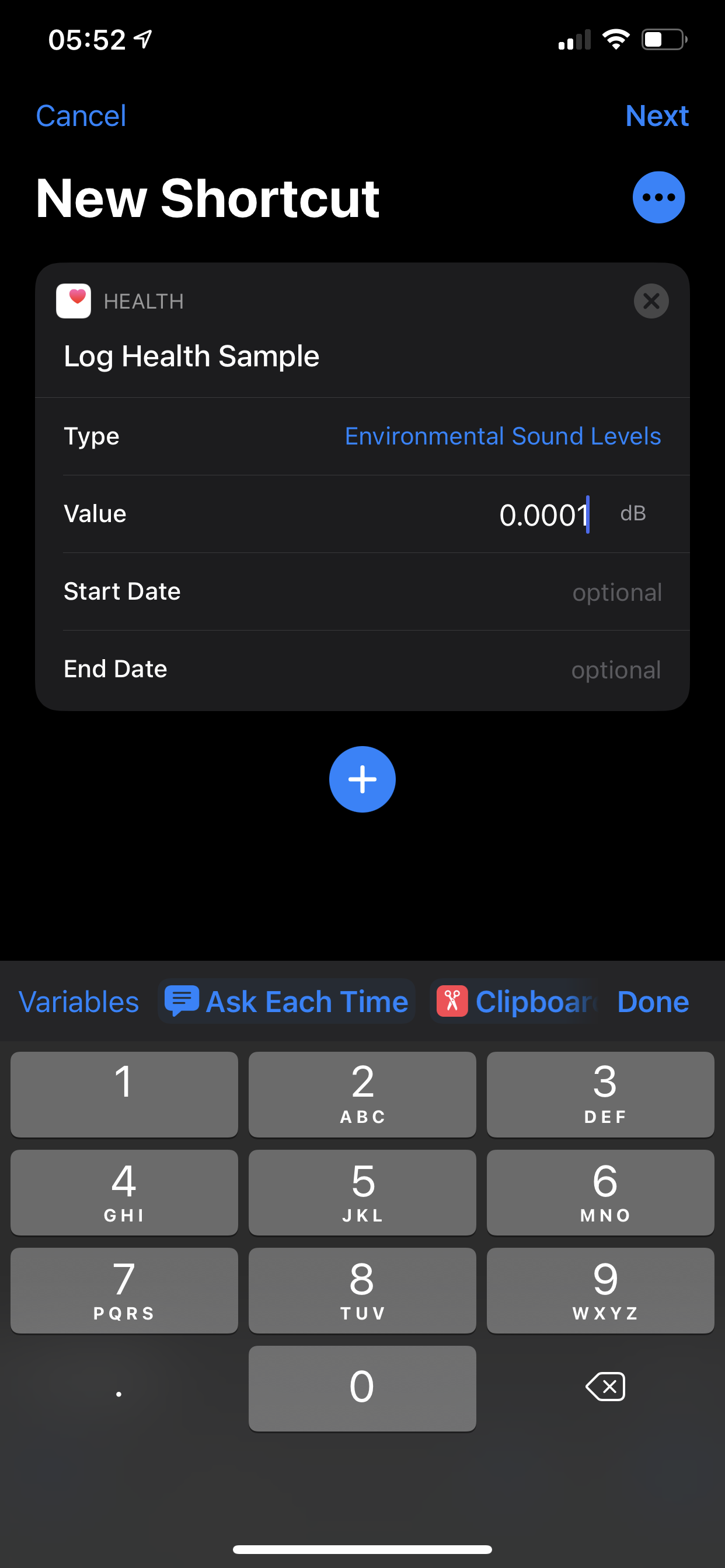 First. Create a shortcut to add Health Data, log Environmental Sound level to Health app of 0.0000000000001 Db ( for example - just add a low value).