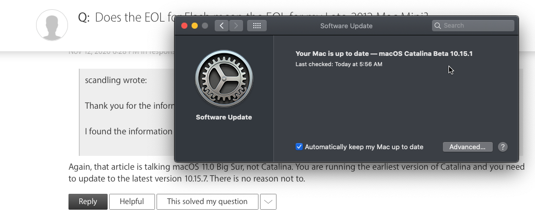 Hi, I'm wondering what the limitations will be for those of us running Safari 13, after Flashplayer's EOL on December 31, 2020. I've got a Late-2012 Mac Mini, the i5 version (2.5 GHz), with 16G RAM, and an SSD. It runs beautifully on macOS Catalina Public Beta 10.15.1. According to Apple, I cannot update macOS beyond the version of Catalina I'm currently running. I believe this also precludes me from updating to Safari 14, which does not rely on Flashplayer.