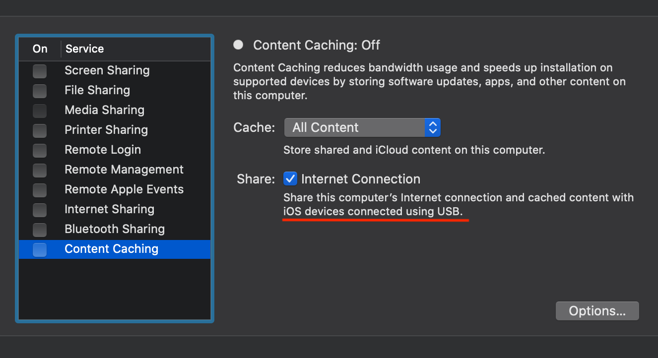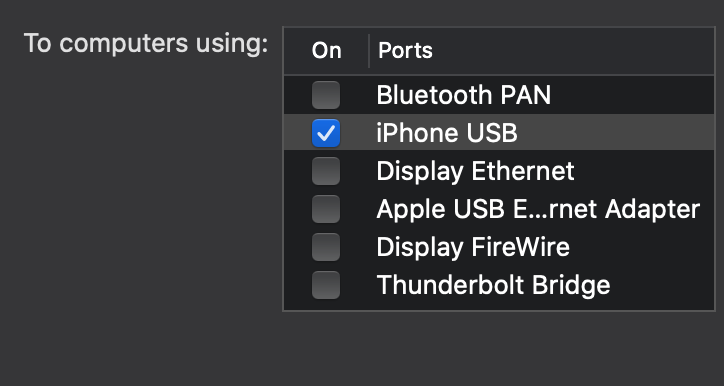 I'm unable to share my Ethernet connection with my iPhone over USB. I tried both the 'Internet Sharing' and the 'Content Caching' methods. I can see the iPhone in Finder but the iPhone does not connect to the internet. I can also see and select 'iPhone USB' inside 'Internet Sharing' when the iPhone is connected.