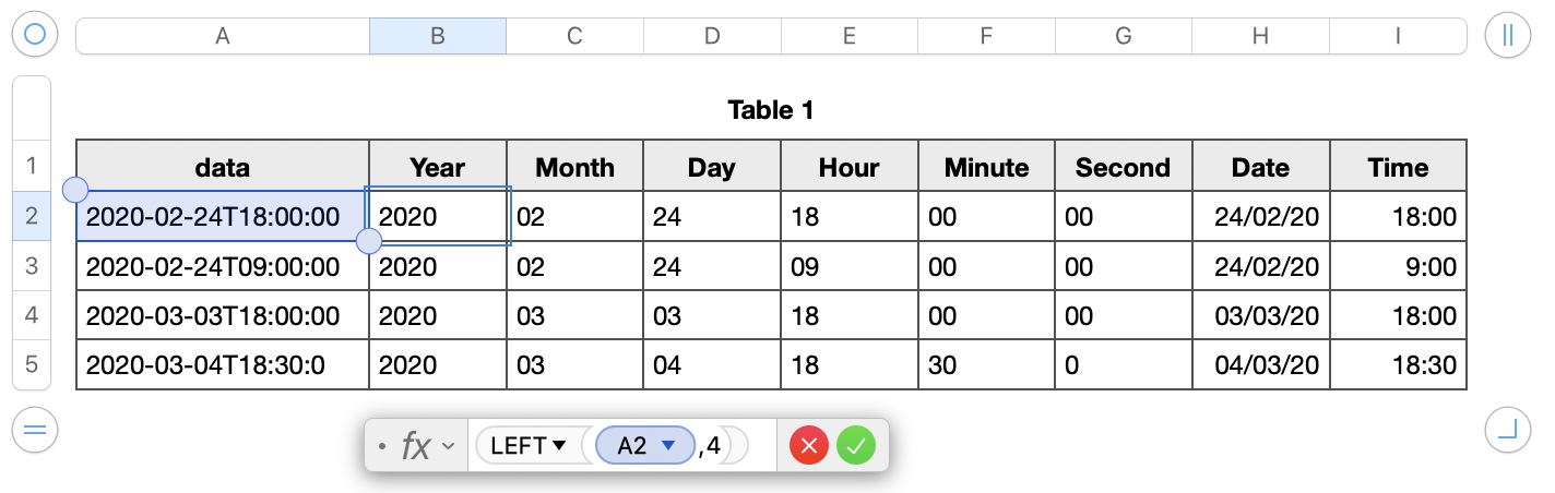 B2 = LEFT (A2,4) works fine and extracts the first four digits of the date. While the formulas C2 = MID (A2,6,2) ... don't work. I guess the MID command is MEDIANA (?). Or maybe something else? Should the cells in Column A be in date, number or text format?