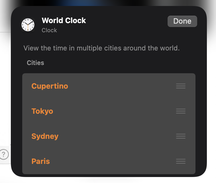 Once Edit Clocks is open, I click on the cities (simple and double) and nothing happens. Also the Done button on the right top corner does not work. The only way I can exit the edit mode of the clock, is by clicking outside of it. Edit: After restarting the computer, it works fine.