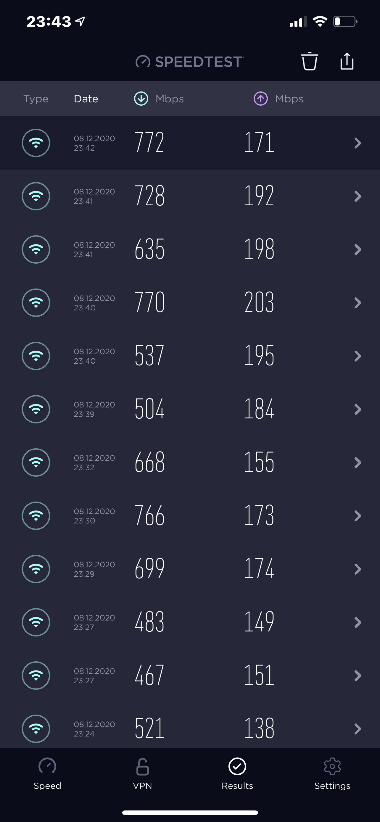 My MacBook Pro recorded 49Mbits down and Iphone 12 Pro Max, 24.1Mbits close to half on the 5G Wifi band. My router is wireless n, but sufficient for my ISP plan in Australia.