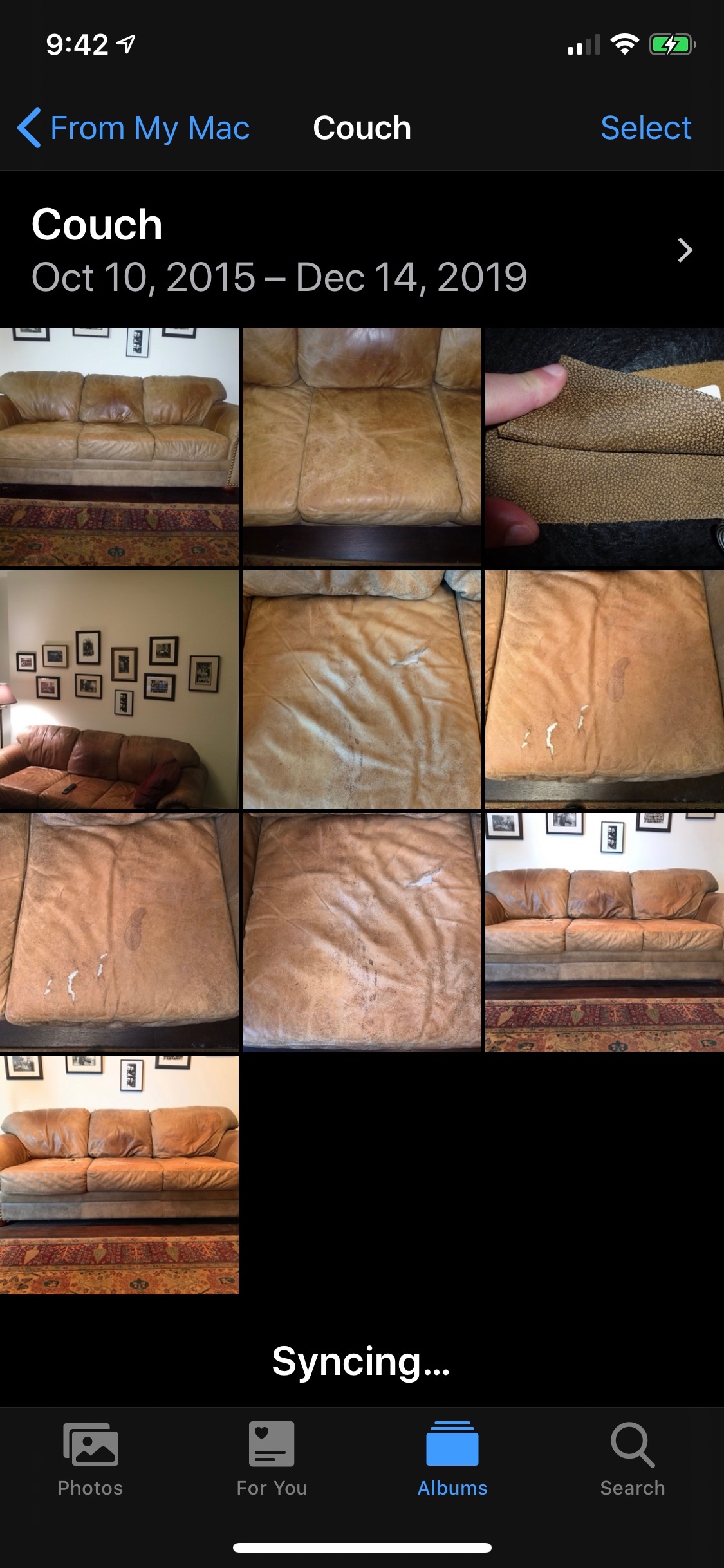 iPhone album says syncing at bottom of screen but never stops and photos are missing.