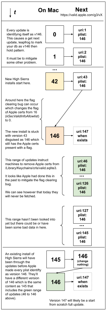 Thanks for you reply. Actually things don't appear as bad as they did earlier with looks toward a fix. I downloaded all the updates from v0 to v146 (not anybody else doing this with wget and no special options note they'll be brotli compressed) and noticed that they are often about 5MB big. So it may be the case that a full update vs an incremental one would be no problem after all. Sometimes mobile carriers don't charge customers for certain traffic and probably Apple have made them do this for traffic to valid.apple.com which in many cases will be a CDN server in the carriers own network anyway. So on that score I think we can push Apple to send a full database, unless of course these databases are supposed to hold some data unique to each machine after all and sending a full database would end up deleting that stuff.
