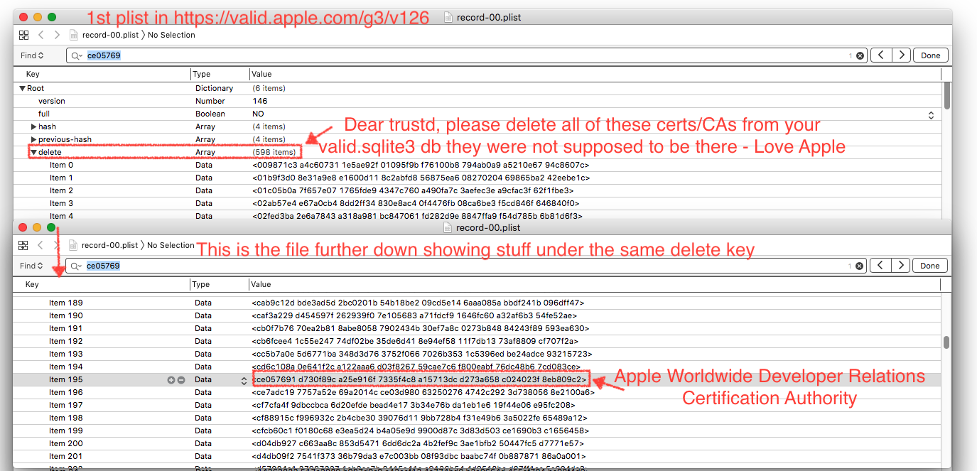 This shows an update command asking for a row in the issuer_hash table matching SHA-256 fingerprint of Apple Worldwide Developer Relations Certification Authority to be removed I believe. That also means to cascade down through the hierarchy and remove certificates (e.g stop them being considered revoked) signed by this CA and that would include our friend with serial 04CA81F77D5E33F7 Apple Mac OS Application Signing.