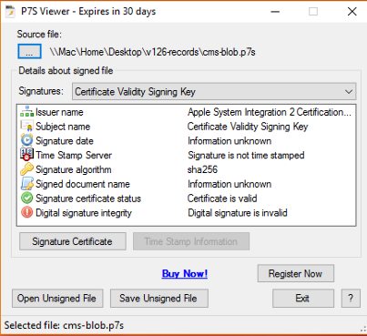 So timestamps are optional and Apple don't put them into their signatures of these updates so it will be pretty hard to say exactly when they signed v126 before sending it on its way. Luckily I found a simple tool for windows that would show the signature for me. I'm sure there is one for the Mac too but this was the quickest route to see what was inside.