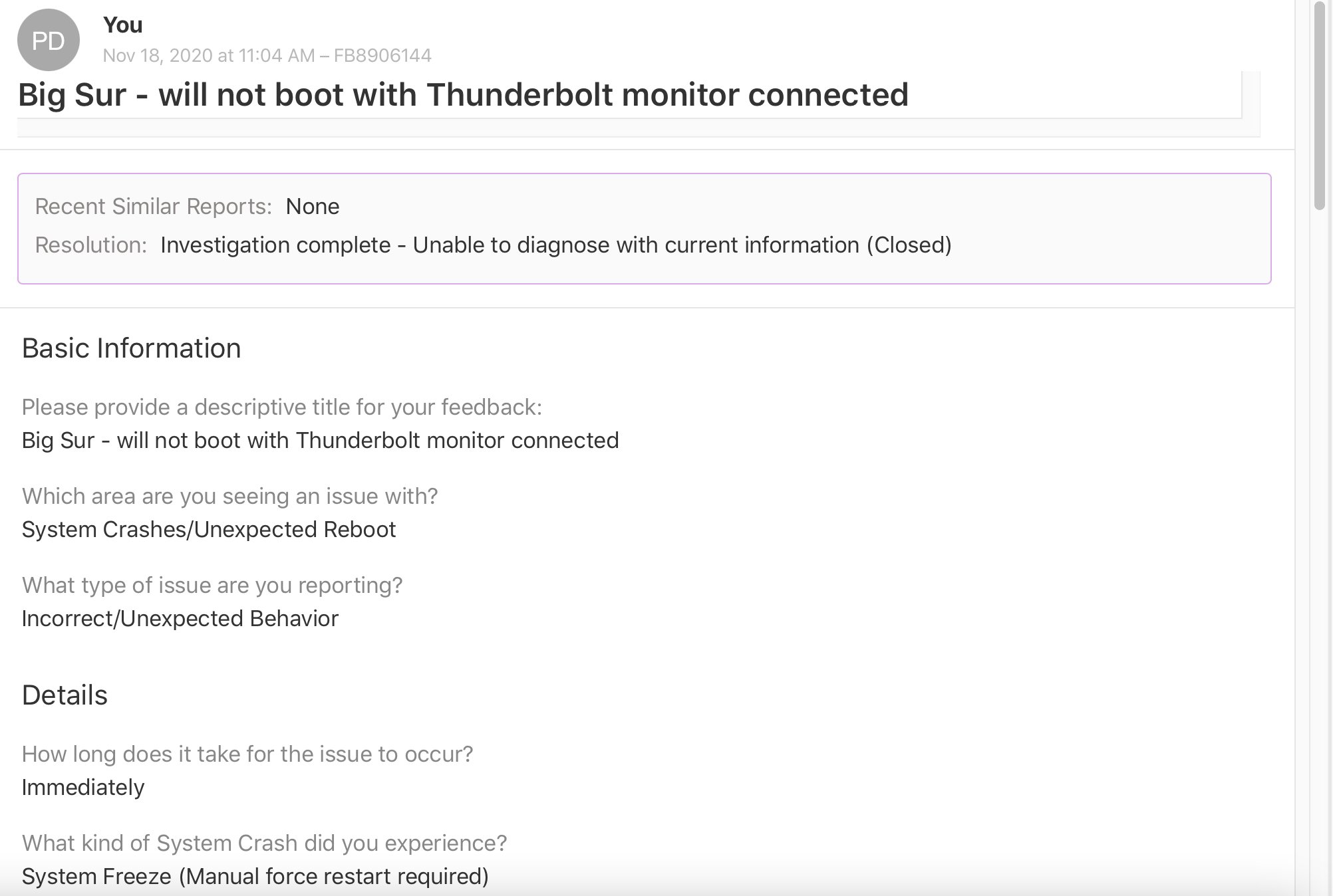 Following update to Big Sur, which also updates the firmware, my MacBook Pro 15 late 2013 will not boot if the Thunderbolt Display is connected. I can downgrade to Catalina but the firmware is not downgraded and the problem remains. I have reported it to Apple Support but wonder if anyone else is experiencing the same issue...
