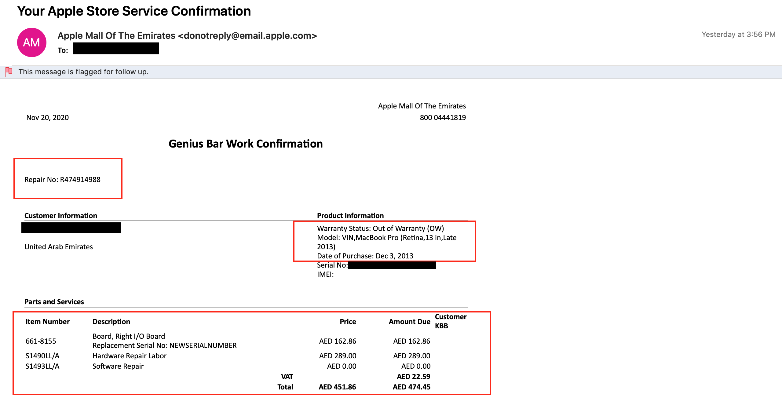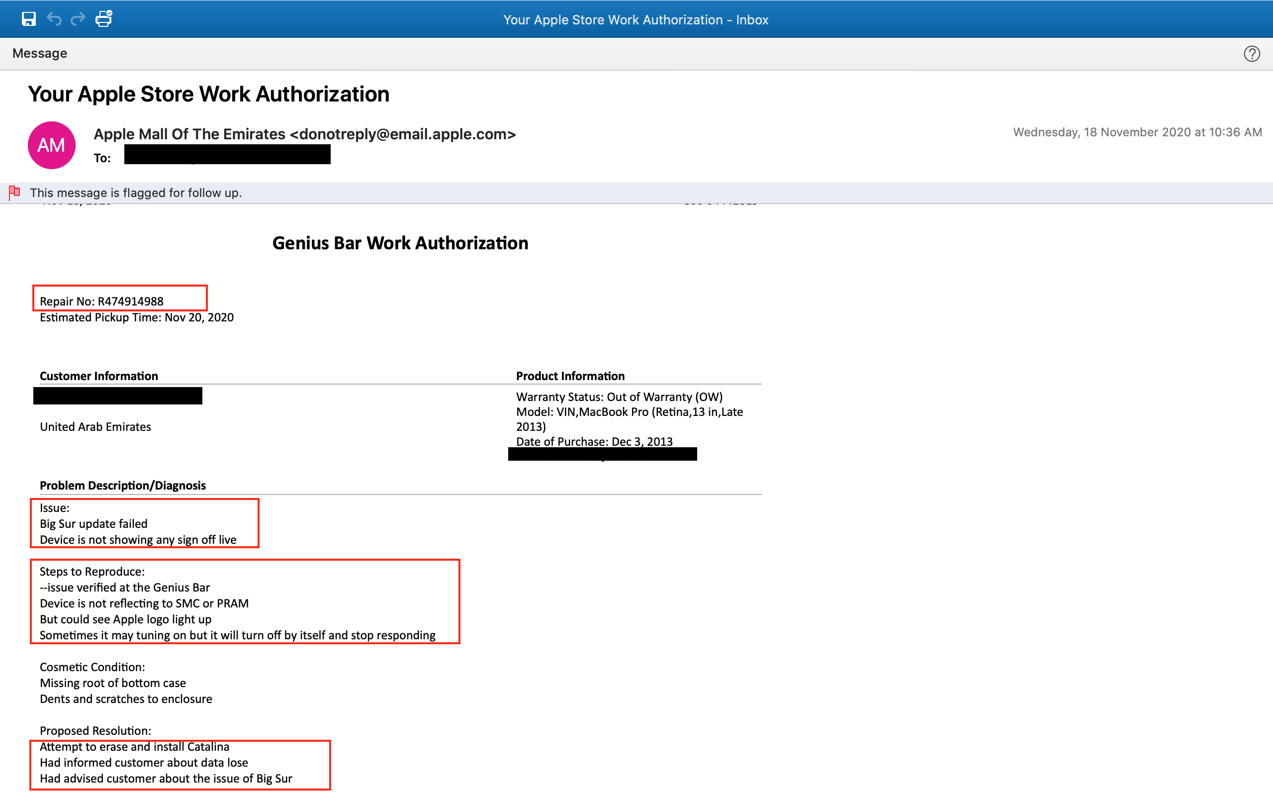 Update: Got my MacBook back from apple repair. I was charged AED 475/- and they put on Catalina on it. Below is the work authorization email as well as copy of the receipt I paid to apple for the damage done by apple.