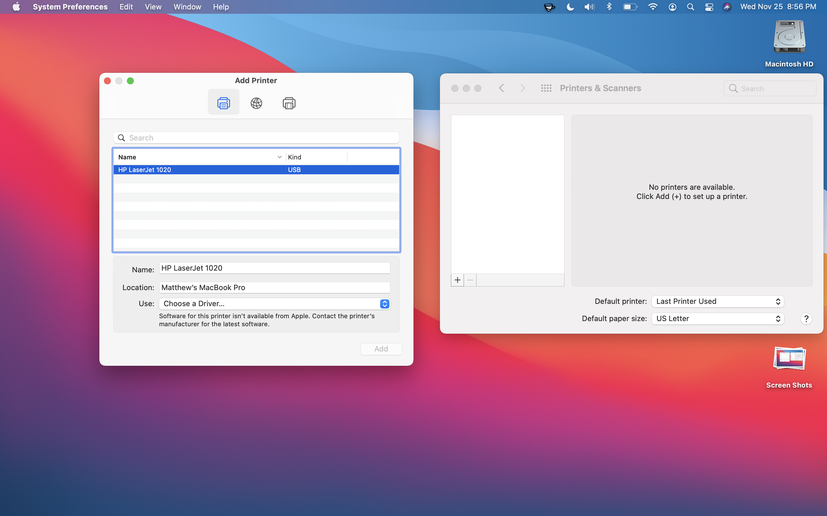 Setup: MacOS BigSur, HP 1020 printer driver installed from previous OS.