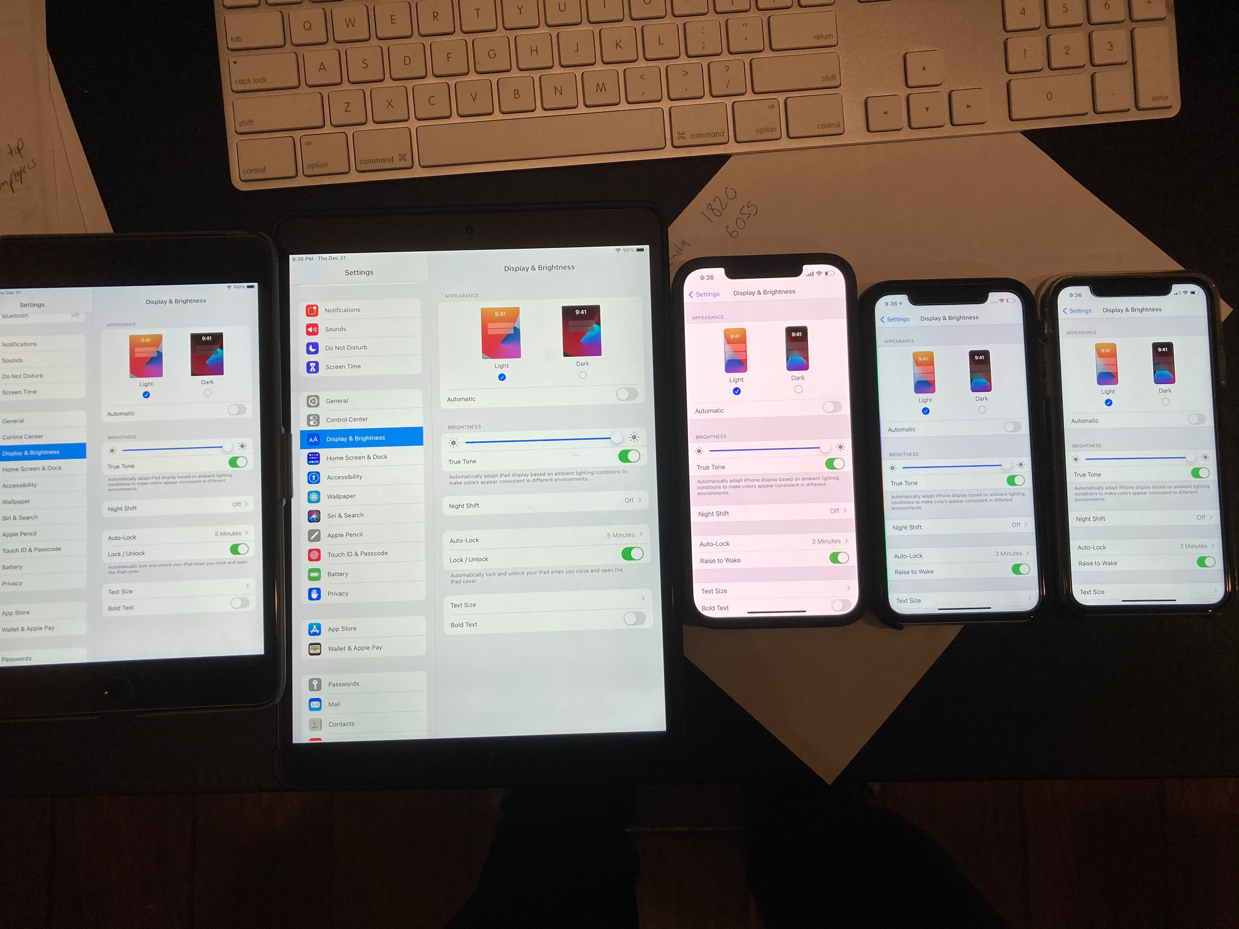 Below: from left to right, iPad Mini 5, iPad Air 3, iPhone 12 Pro Max, iPhone XR, iPhone 11. The one sticking out like a sore thumb is the 12 Pro Max, and while it looks reddish in the photo, it's just white balance from camera being off. It appears very yellow/green in comparison to the others- which are very consistent across the board.