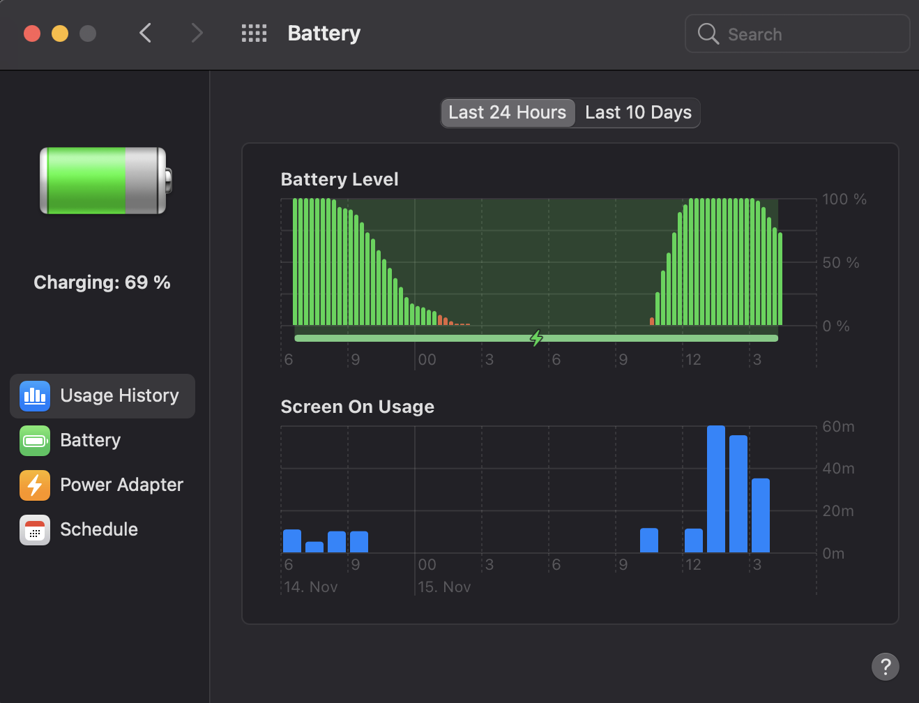 the battery level goes down (from 9pm - 3am). But the horizontal bar with the lightning symbol shows, that the power adapter was connected. That's wrong. During the night, my MacBook was not connected and that is the reason why the battery level goes down.