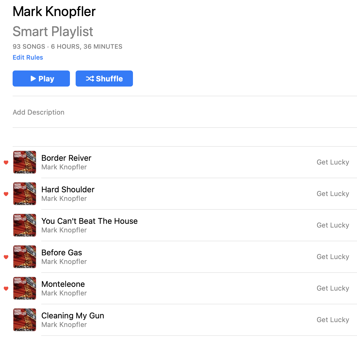 I cannot get this play list to work. Artist contains Mark Knoplfer appropriately finds all his songs and lists them.