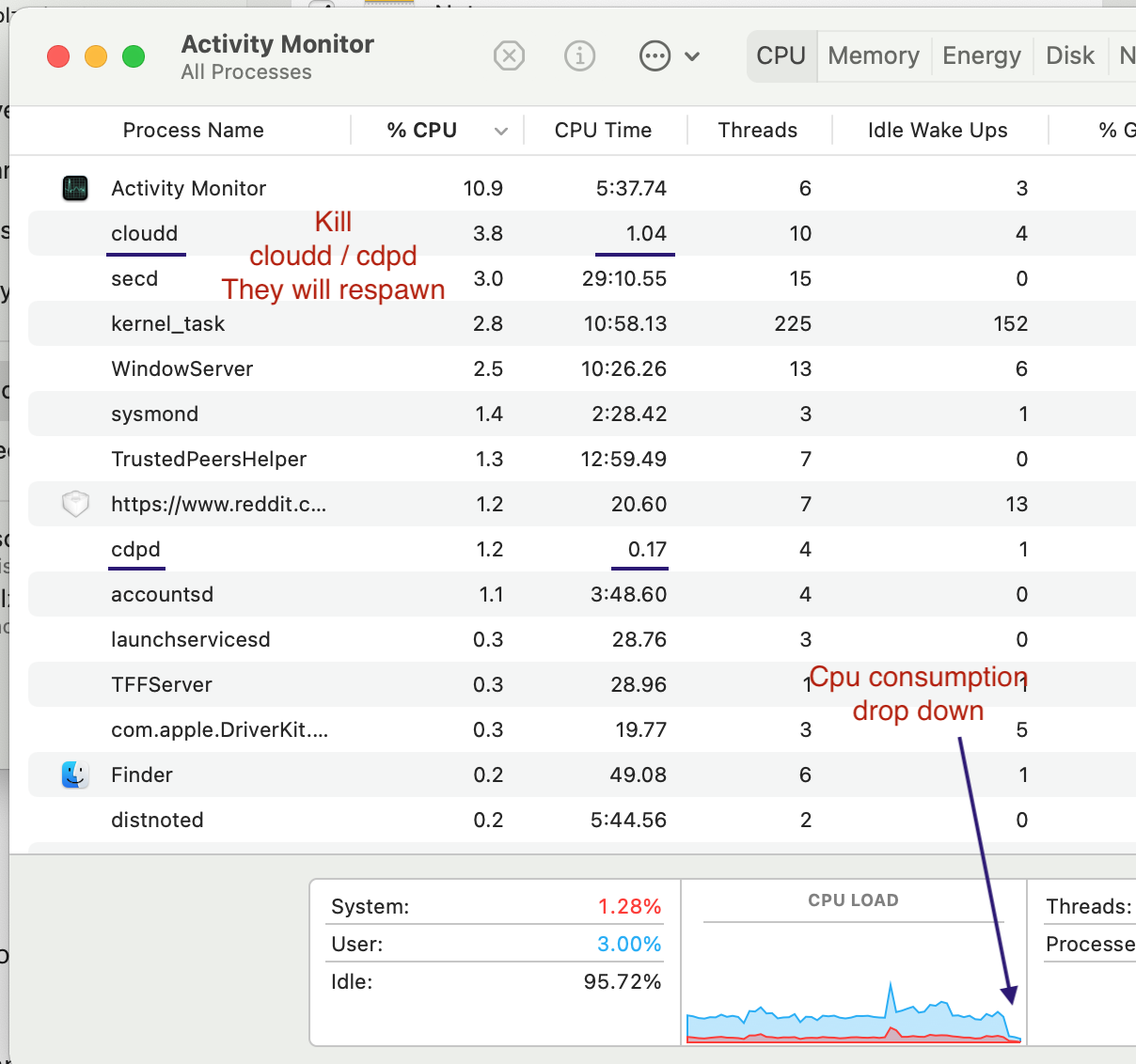 Amazing CPU load dropped down to normal while the two processes ("cdpd" and "cloudd") have come back together. Maybe they are still there so it didn't last long(Figure 4):