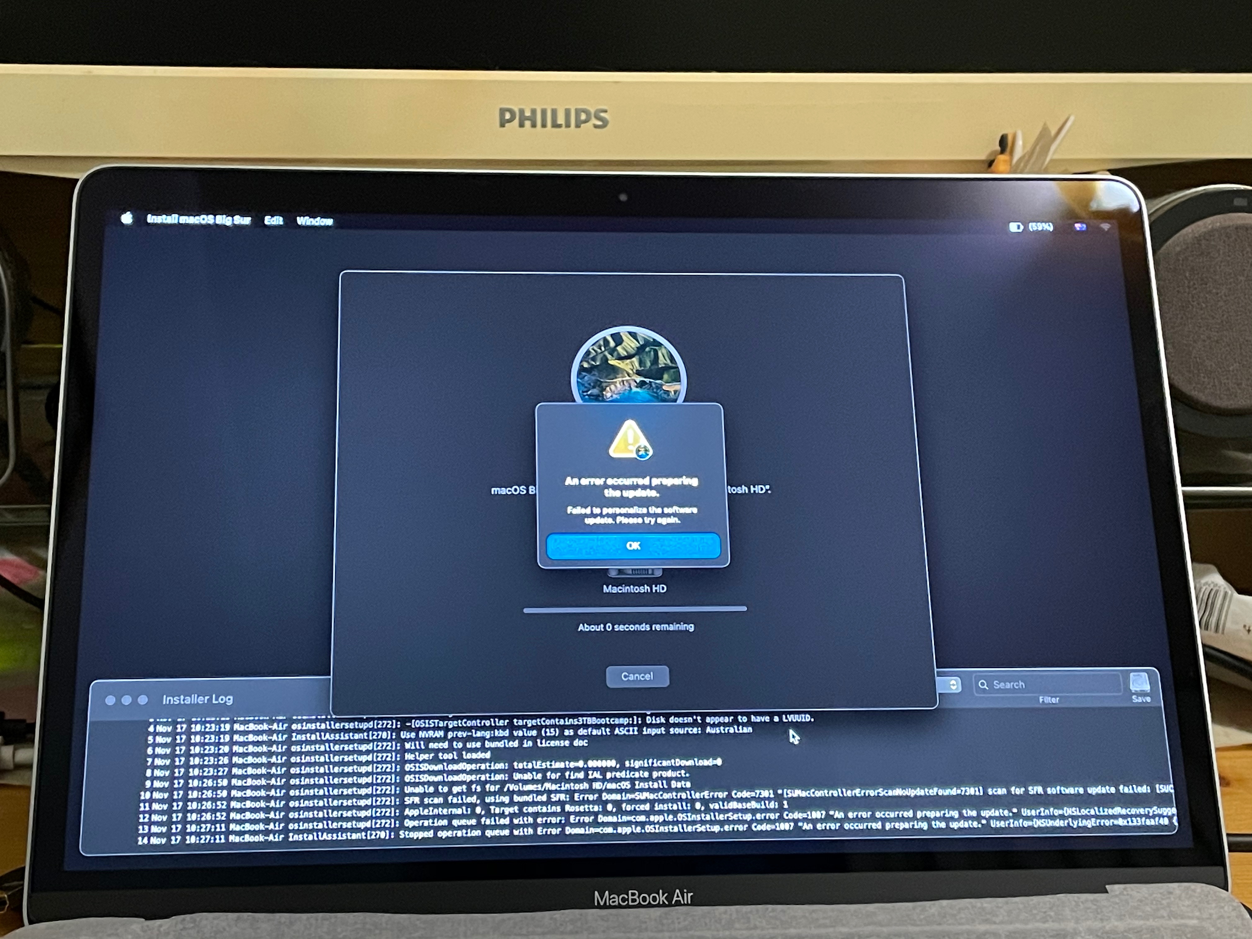 Tried to install to local ssd and external drive, but still got this message: failed to personalize the software update