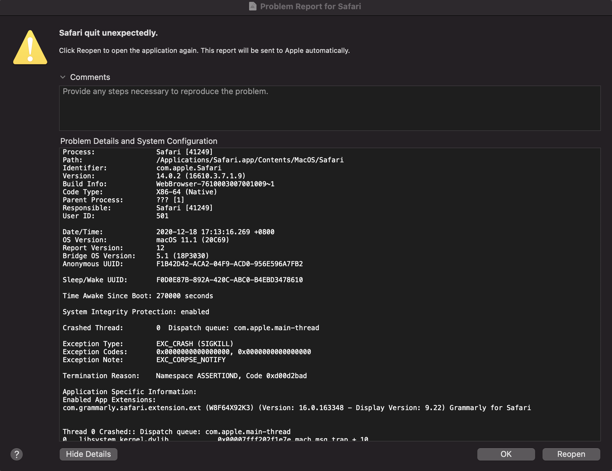 I have just upgraded to the new OS Big Sur. I just experience a crash from Safari. The termination reason is Namespace ASSERTIOND, Code 0xd00d2bad. What is that mean and Why did it crash?