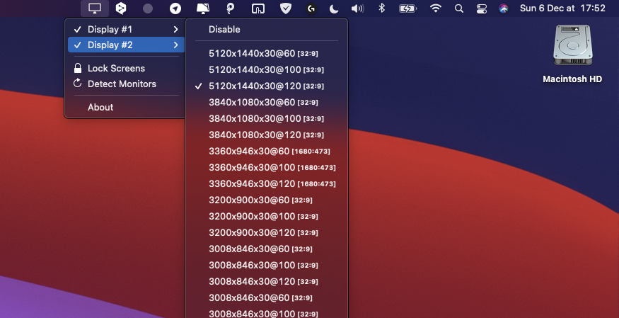 By default, only with the Apple settings it is possible to activate 5120x1440 120Hz with the following procedure, but just after disconnecting from the screen or rebooting the setting is not kept, the GitHub repo just allows to go faster. So I think this is not a hardware constraint, but just an optimization problem. After all it worked fine with an Intel 2020 MacBook Air.