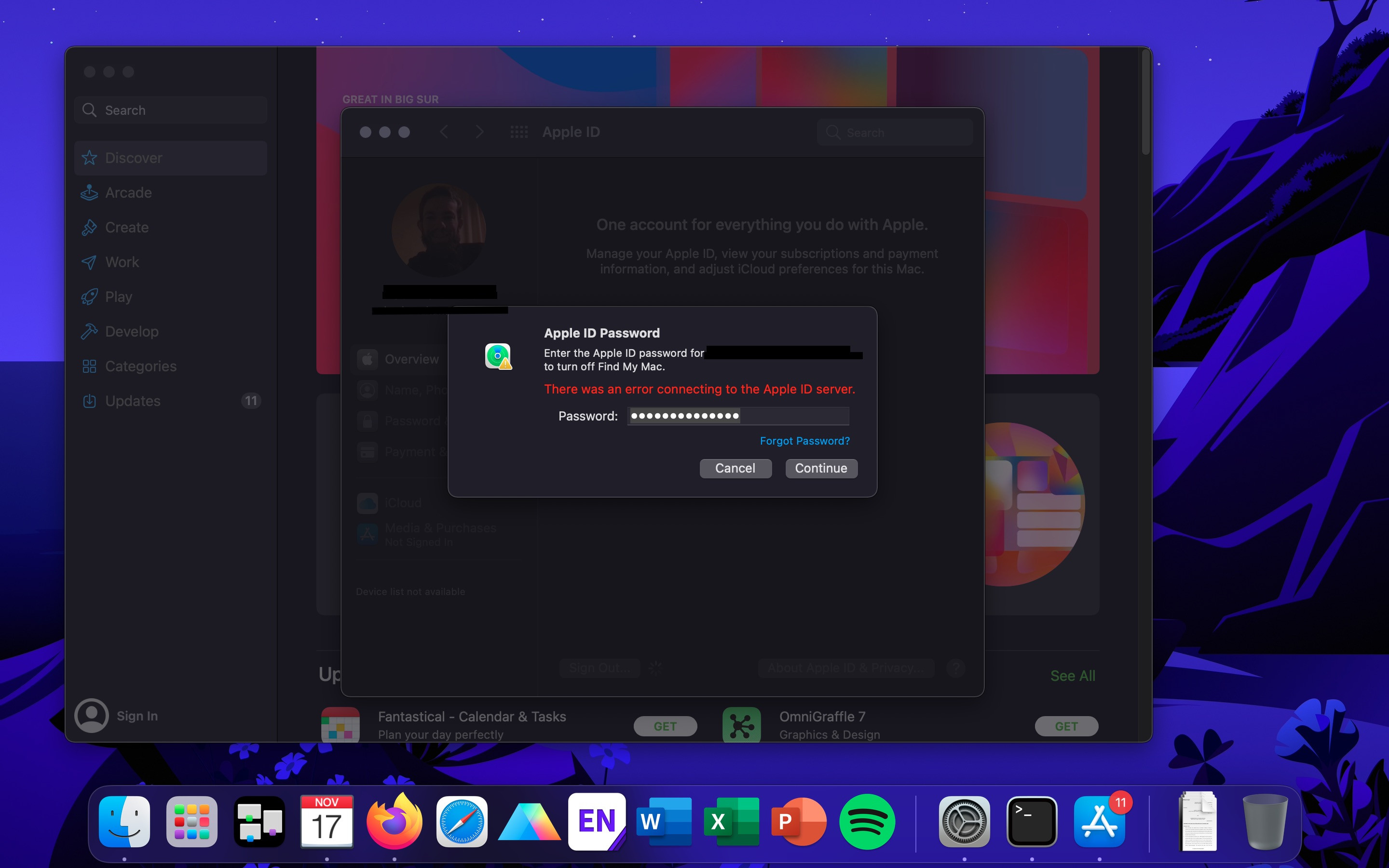I do not understand what is causing this issue. I also do not know if it is safe to attempt to reset the laptop. I tried to sign out of my Apple ID in system preferences, but this requires me to enter my password to turn off Find My Mac. This request fails each time, with the same error message "There was an error connecting to the Apple ID server"
