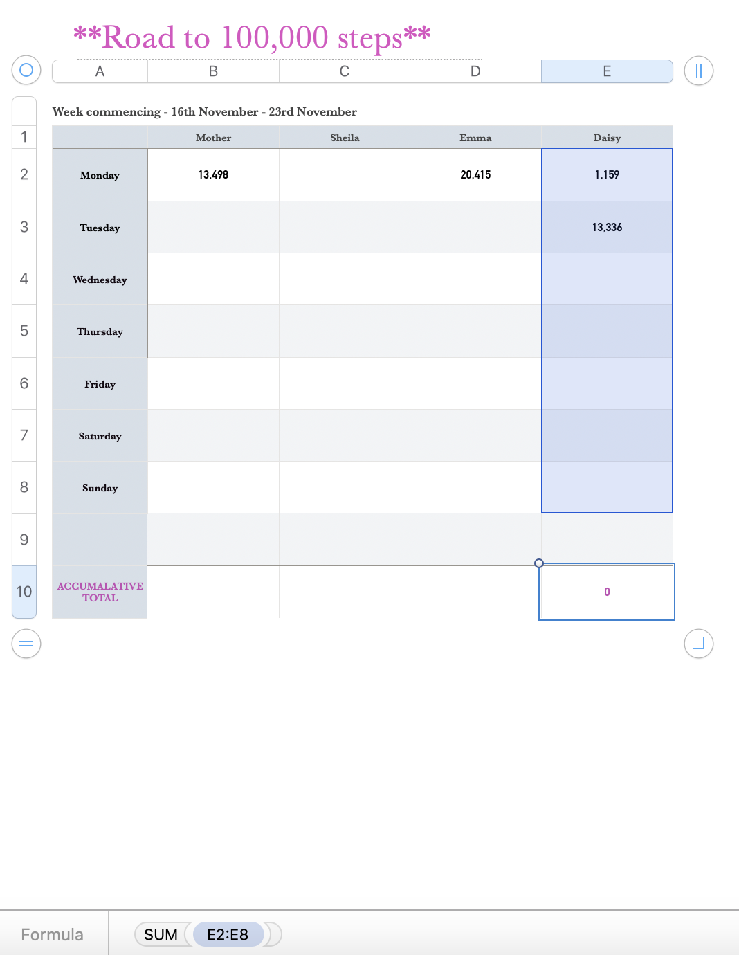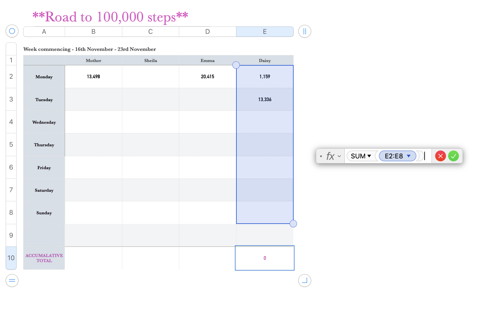 The E reference is to all cells in column E, except cells that are in a Header row and cells that are in a Footer row. As you add more rows to the table (if needed), they are automatically included in the SUM(E) calculations.