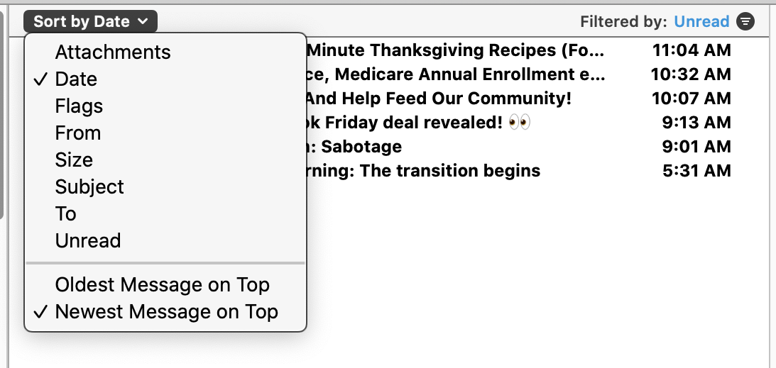 It sounds like you are viewing your mail with Column View. If so you can click on a column heading to sort by that column.
