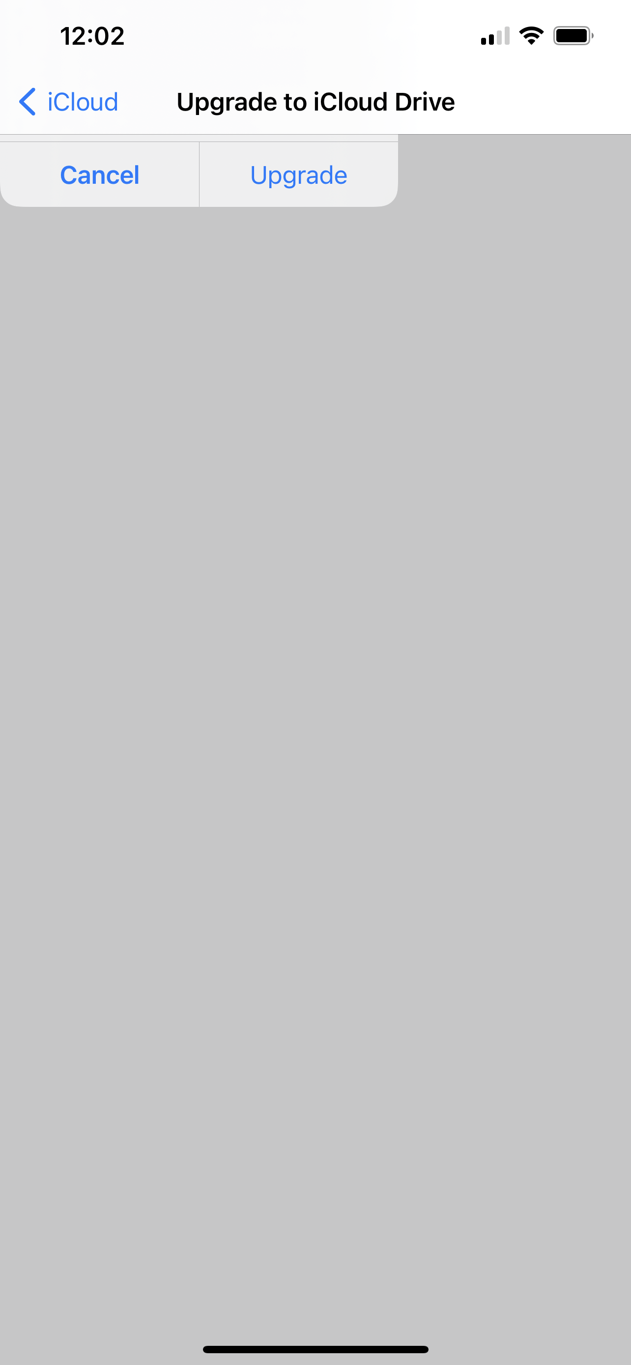 iOS 14, iPhone 12 pro max. when I try to turn on iCloud Drive in setting there is some sort of bug, gray screen with only a cancel and an update button in it that don’t do anything. What’s causing this? Can it be remedied?