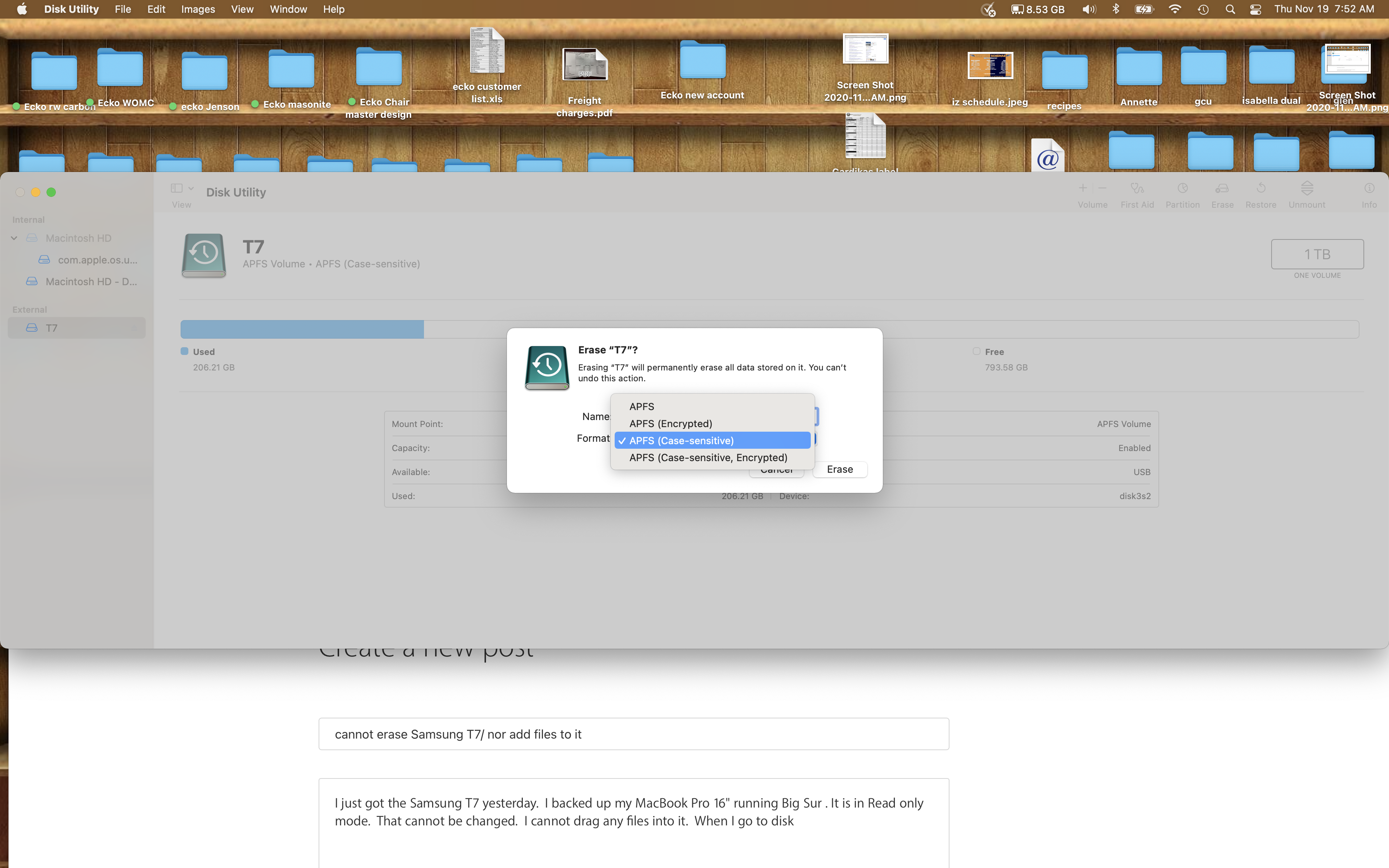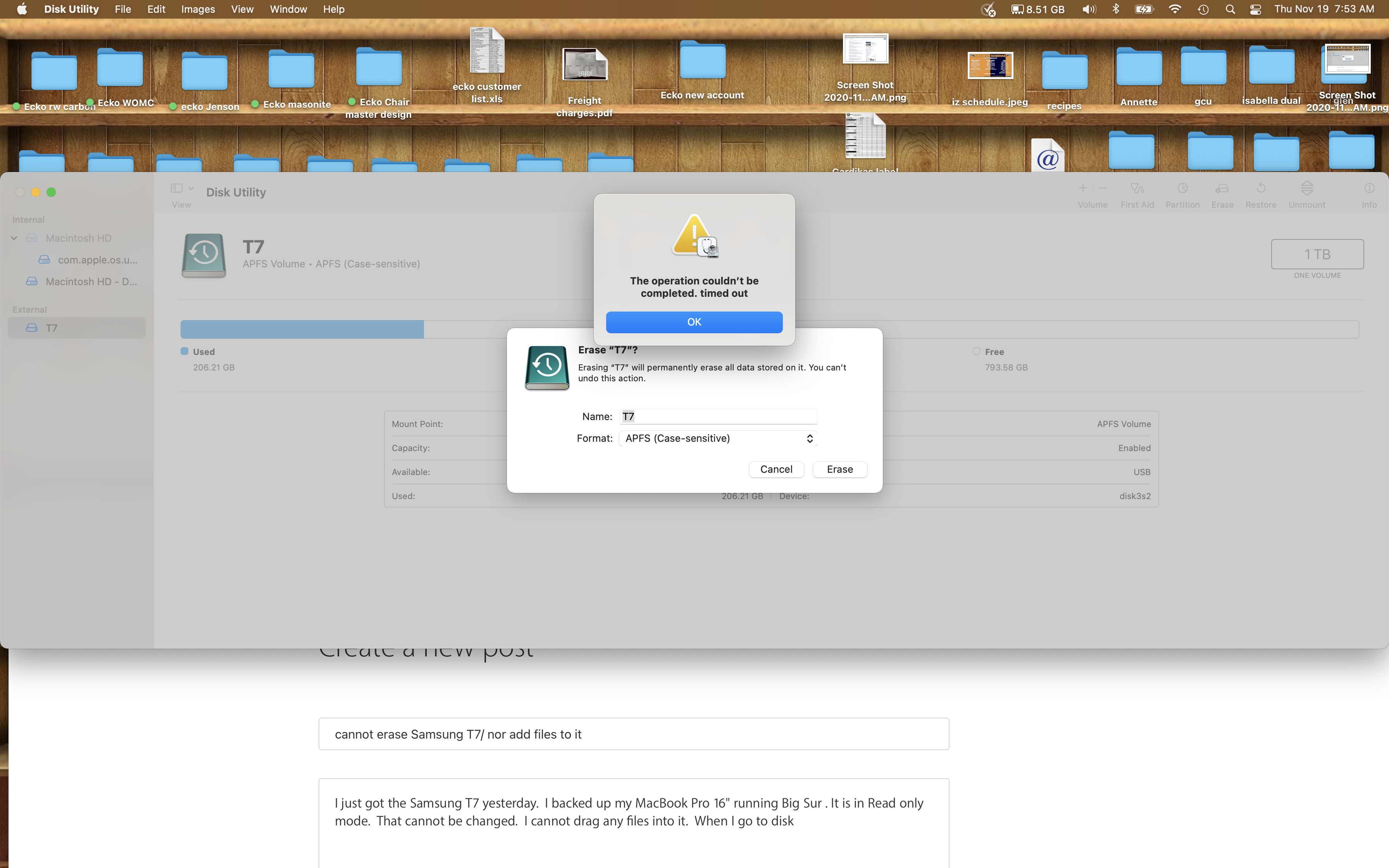 I just got the Samsung T7 yesterday. I backed up my MacBook Pro 16" running Big Sur . It is in Read only mode. That cannot be changed. I cannot drag any files into it. When I go to disk utility to erase it and start over I get the following. screen shots included. you can see the only choices I have for reformat and the error code. second and third screen shots out of order....is it just a bad drive and I should send back to amazon?