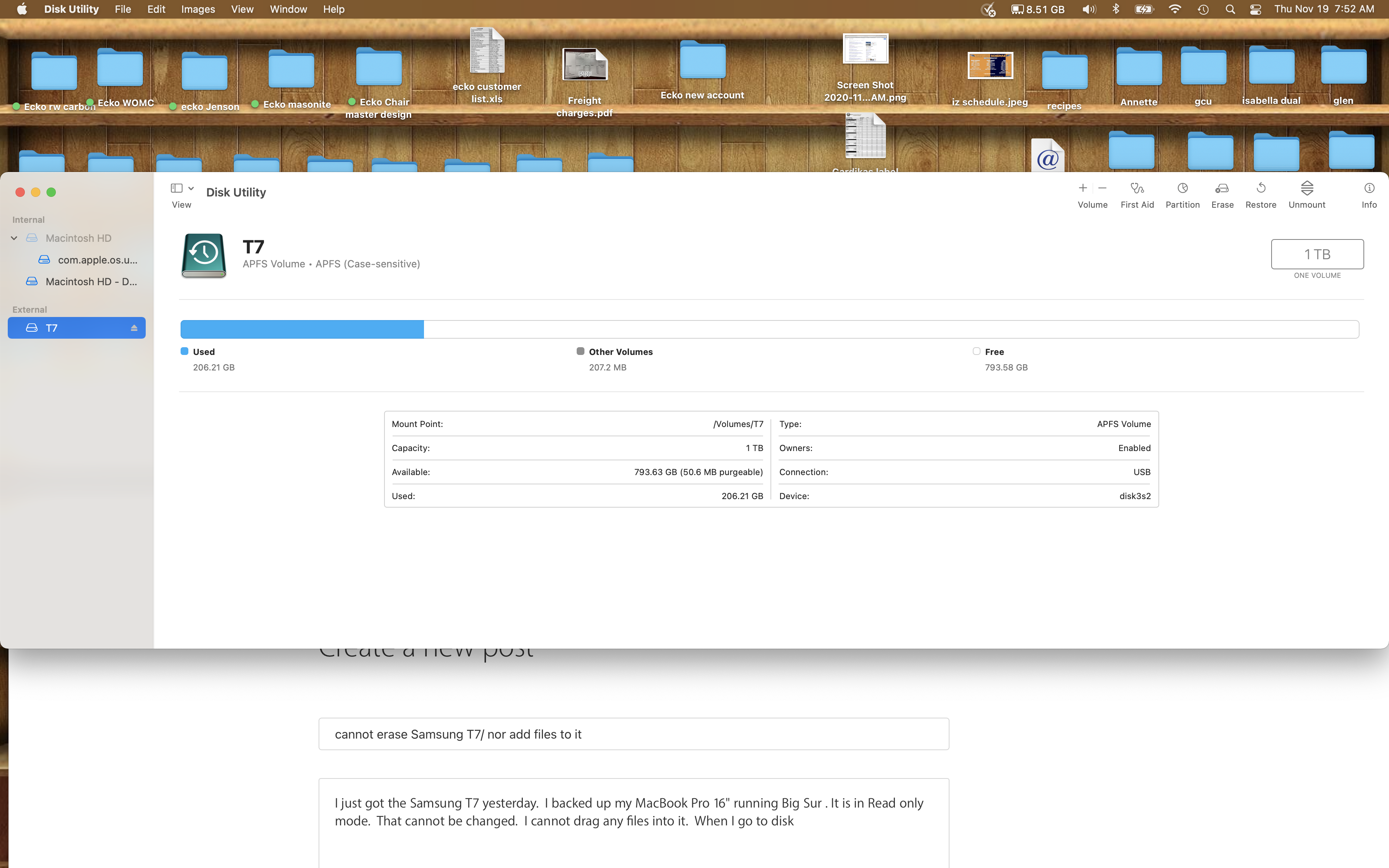 I just got the Samsung T7 yesterday. I backed up my MacBook Pro 16" running Big Sur . It is in Read only mode. That cannot be changed. I cannot drag any files into it. When I go to disk utility to erase it and start over I get the following. screen shots included. you can see the only choices I have for reformat and the error code. second and third screen shots out of order....is it just a bad drive and I should send back to amazon?