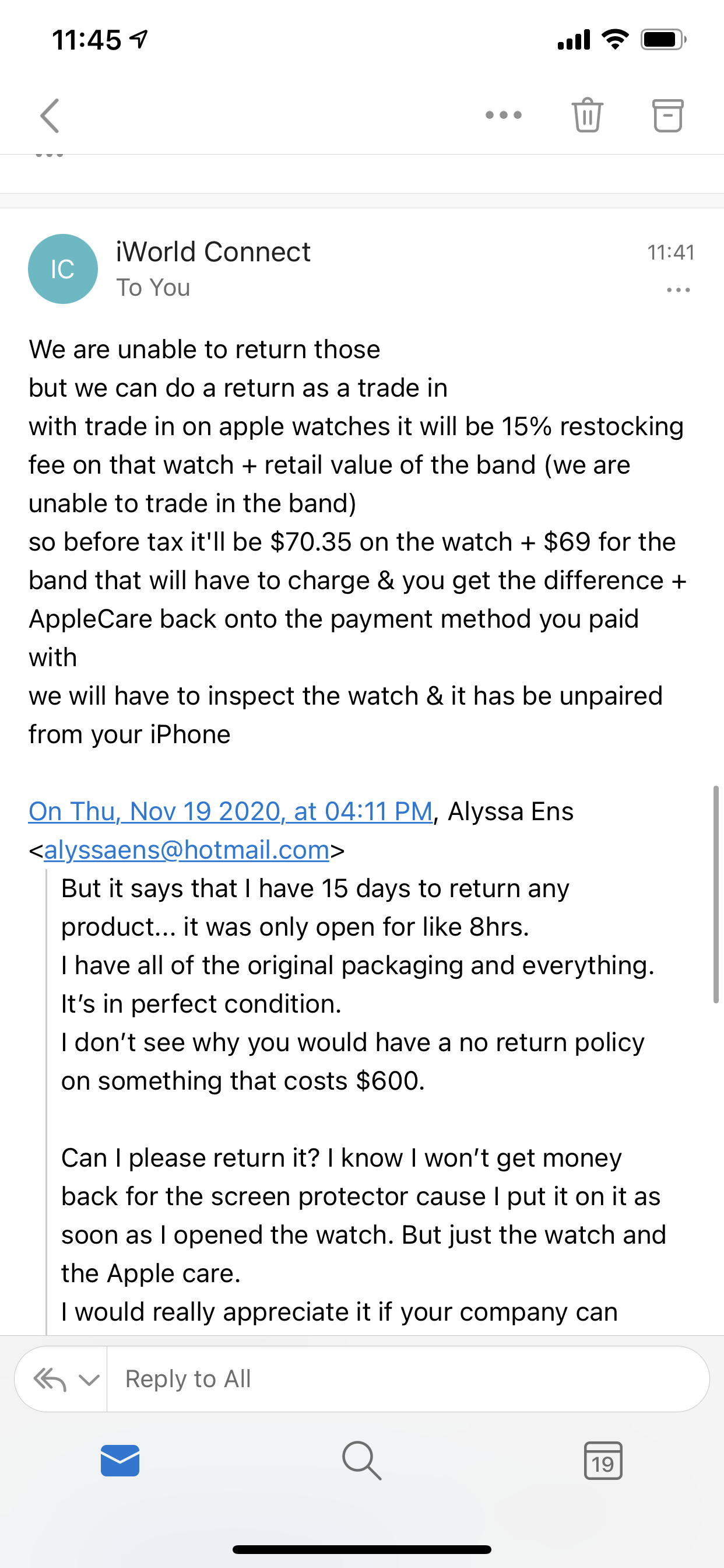 Can anyone tell me why Iworld doesn’t accept returns on an “open watch” which I find ridiculous because I just found out from my sister that my mom bought me an Apple Watch for Christmas and I want to return the one I just bought. I have all the original packaging and I only wore it for like 8hrs so it’s in perfect condition still.