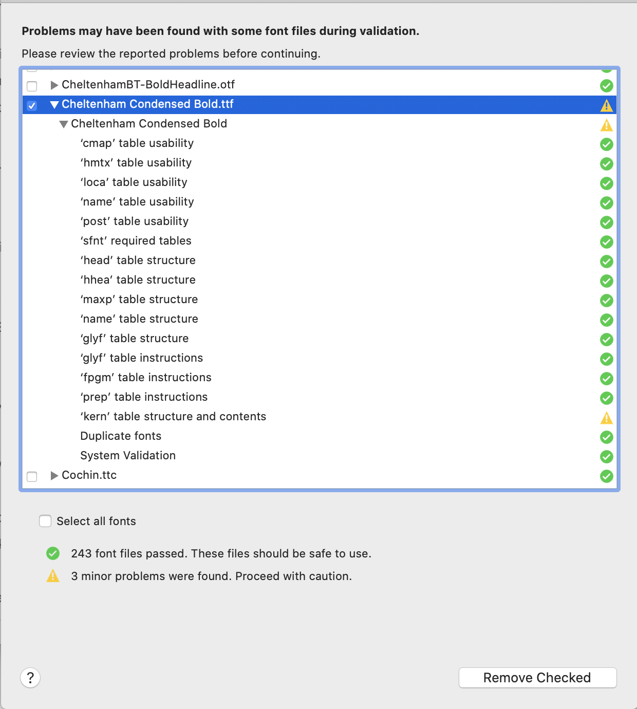 This question has been asked before and the solution was to validate all fonts in Fontbook. I did that and all but three validated. But those three only had minor kerning issues. So, that hasn't solved my problem. The latest email to do this was from Amazon. But it happens with others as well.