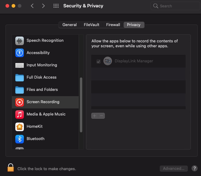 2. Navigate to Settings-> Security & Privacy -> Privacy -> Screen Recording -> Select the check box against Display Link Manager.