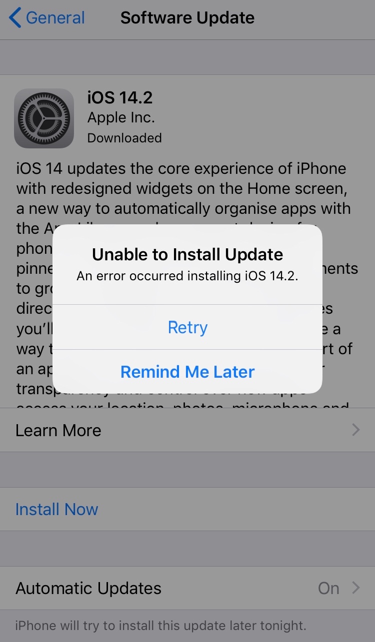 Problems with installation of iOS 14.2 after downloading. It says an error has occurred.