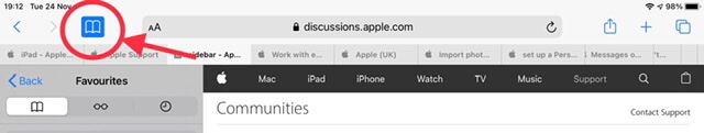 Very simple. Tap the blue “book” icon to hide or show the Safari Sidebar: