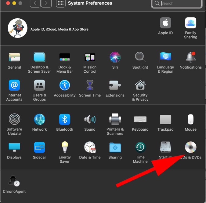 NOTE: the optical drive must be turned on and connected to the Mac for the CDs & DVDs pane to be visible