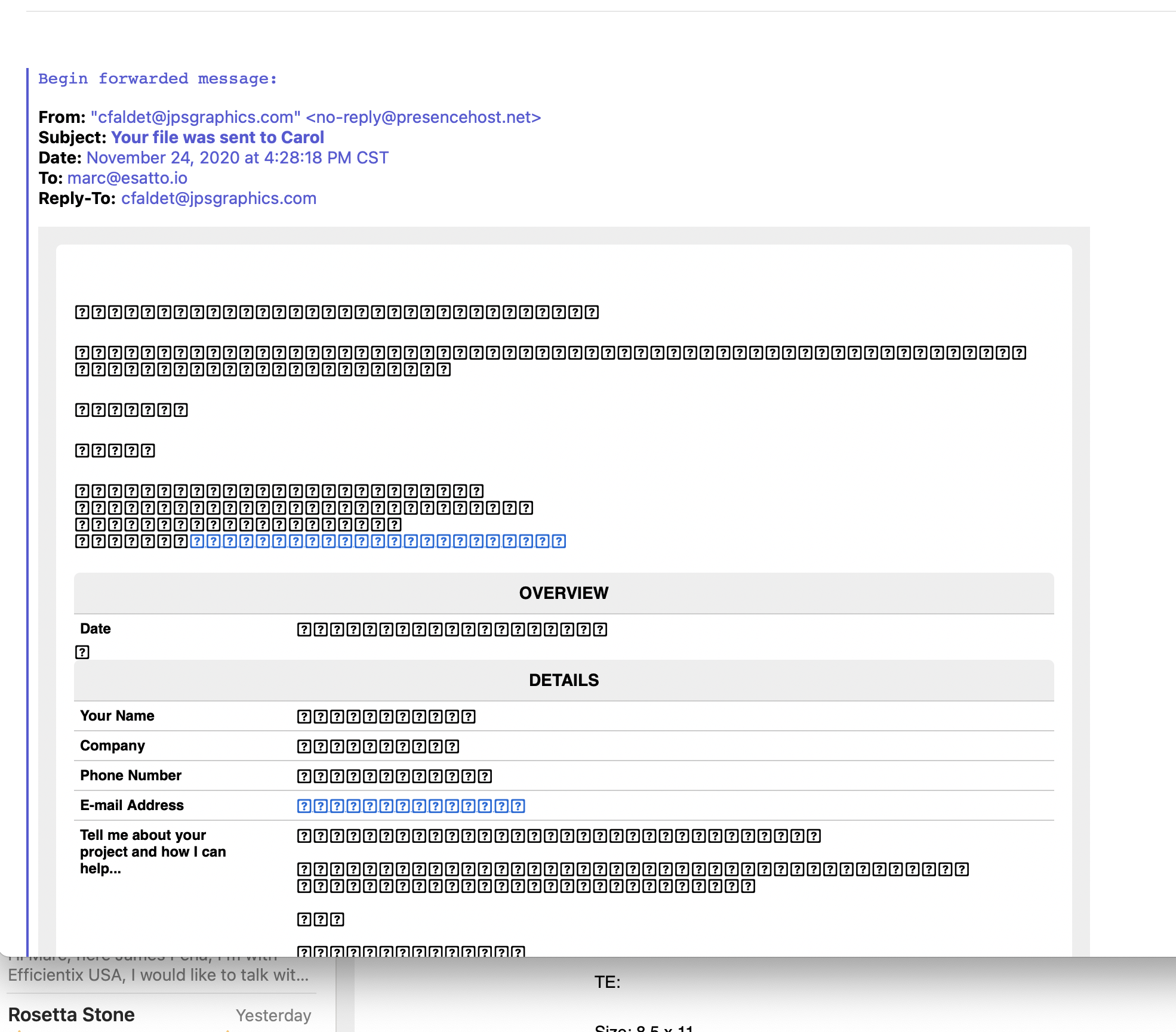 Then, when I attempt to forward an email... most of the text turns into boxed question marks.