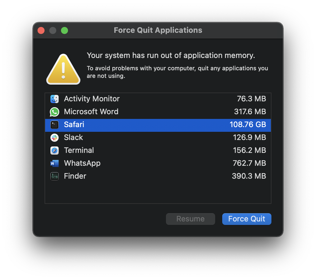 I recently upgraded to BigSur OS. From then on I keep getting "System out of application memory" error stating that Safari is consuming over 100GB of memory while I just open a Jupyter Notebook or a web page that takes longer to load (even on YouTube and LinkedIn). And even when idle, Safari is consuming over 20GB of memory whereas my memory is just 16GB. Here is a screenshot of the recent message. Is it just me or anyone who's facing this issue?