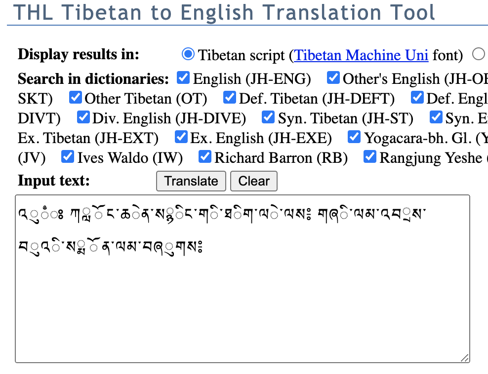 Two images attached to illustrate my point. The first is a screen shot of how Tibetan text appears in a webpage when it is embedded in the HTML. The second shows where I attempted to type the same text into the input field of an online dictionary. As you can see, the vowels and any subjoined letters or roots that should stack are instead detached.