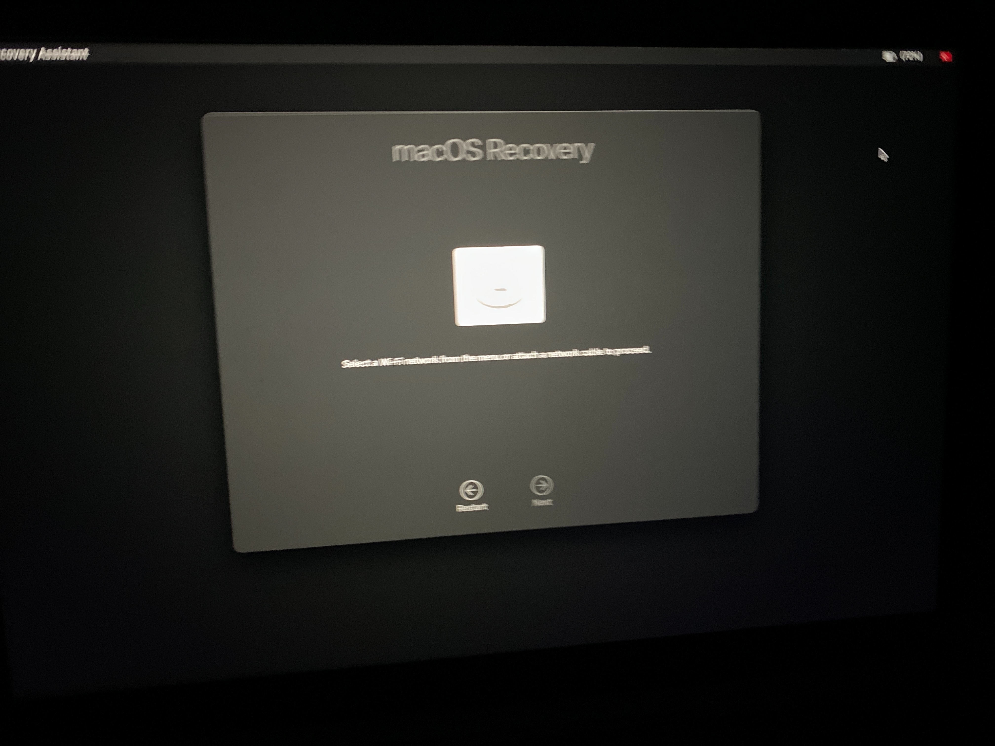 I was formatting my mac and while I was reinstalling big sur mac asked me for wi-fi connection I was connected to wi-fi befıre going to recouvery mode and now I can’t re-install big sur. The wi-fi icon on the upper right doesn’t show up and I am stuck on this screen.