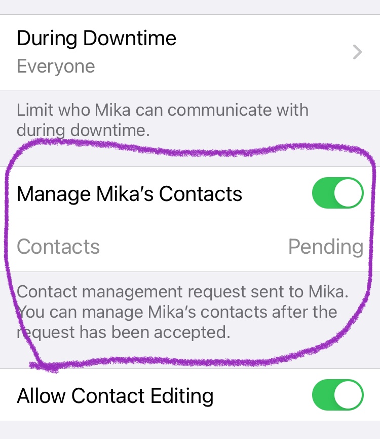 When setting Communication limits, Manage child’s contacts, it says “Contact management request sent to .... You can manage .....’s contacts after the request has been accepted “