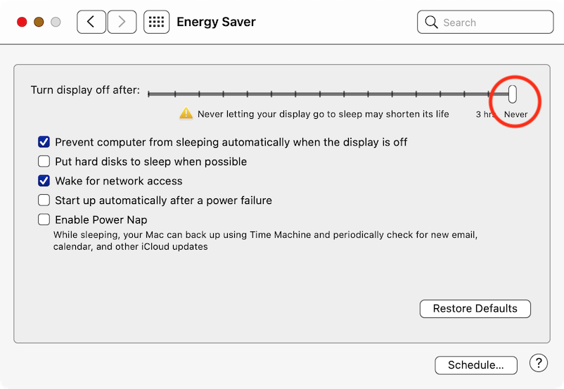 On my iMac (21.5-inch, 2017) with macOS Big Sur version 11.0.1) I installed software "SecuritySpy Version 4.2.12) with which I record surveillance images from cameras. Recently my iMac goes into sleep mode after a few hours and no more images will be recorded How can I adjust my iMac to stay active Or is it the beaking software Thanks.
