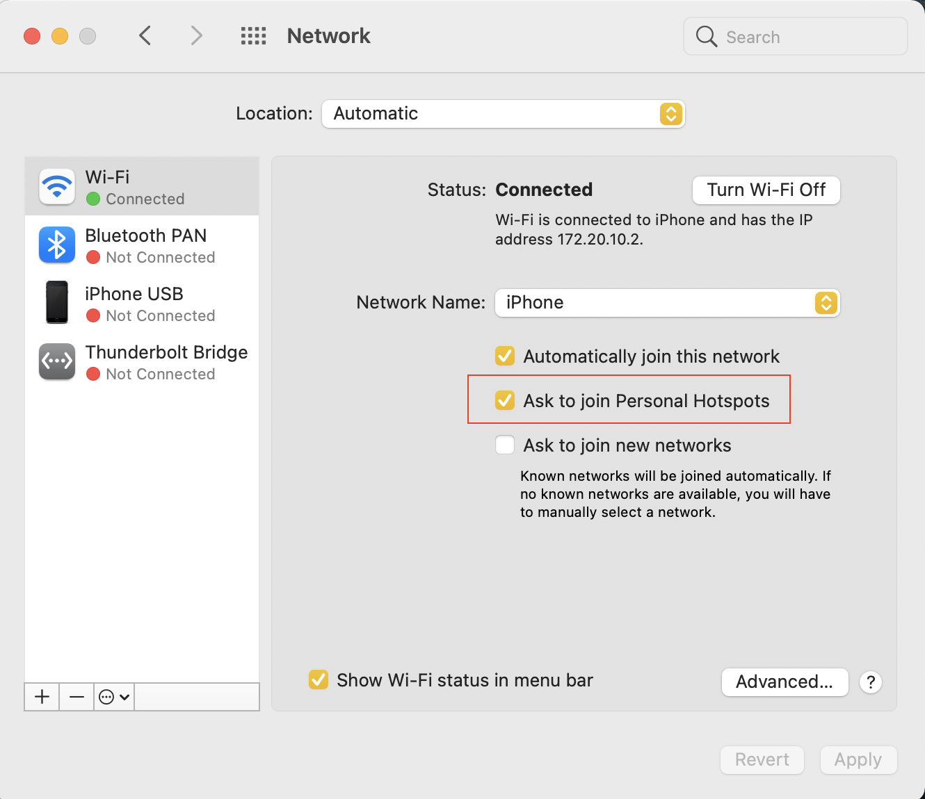 With High Sierra the connection to my iPhone was Automatic or my iPhone appeared automatically when I clicked on the wifi symbol, however now with Big Sur it does not appear and does not pair automatically with the iPhone which is really annoying and make me lost times every time my Mac power on or go off sleep mode ....