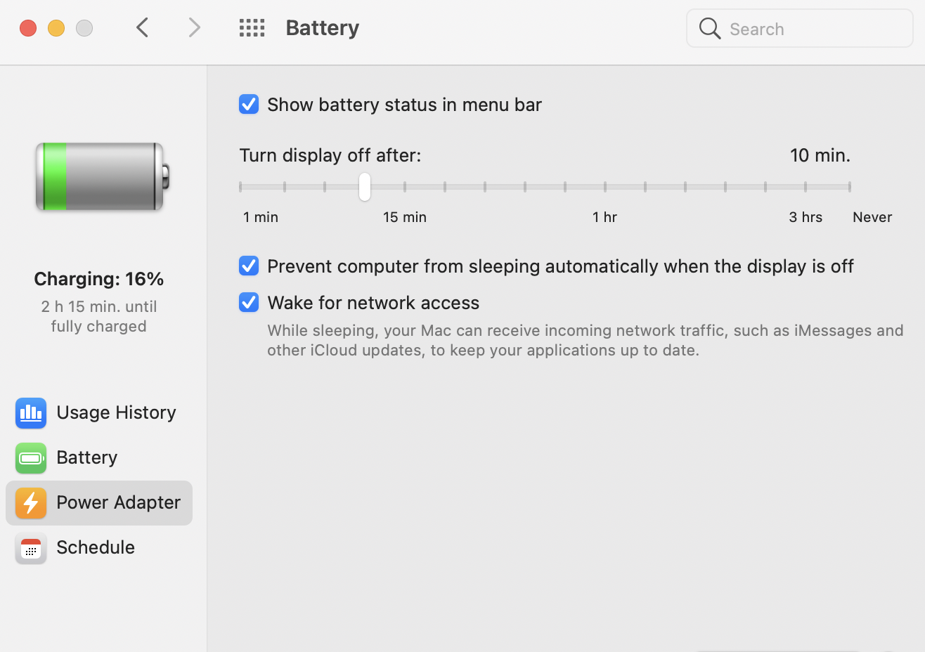 Check the options under ”power adapter”?