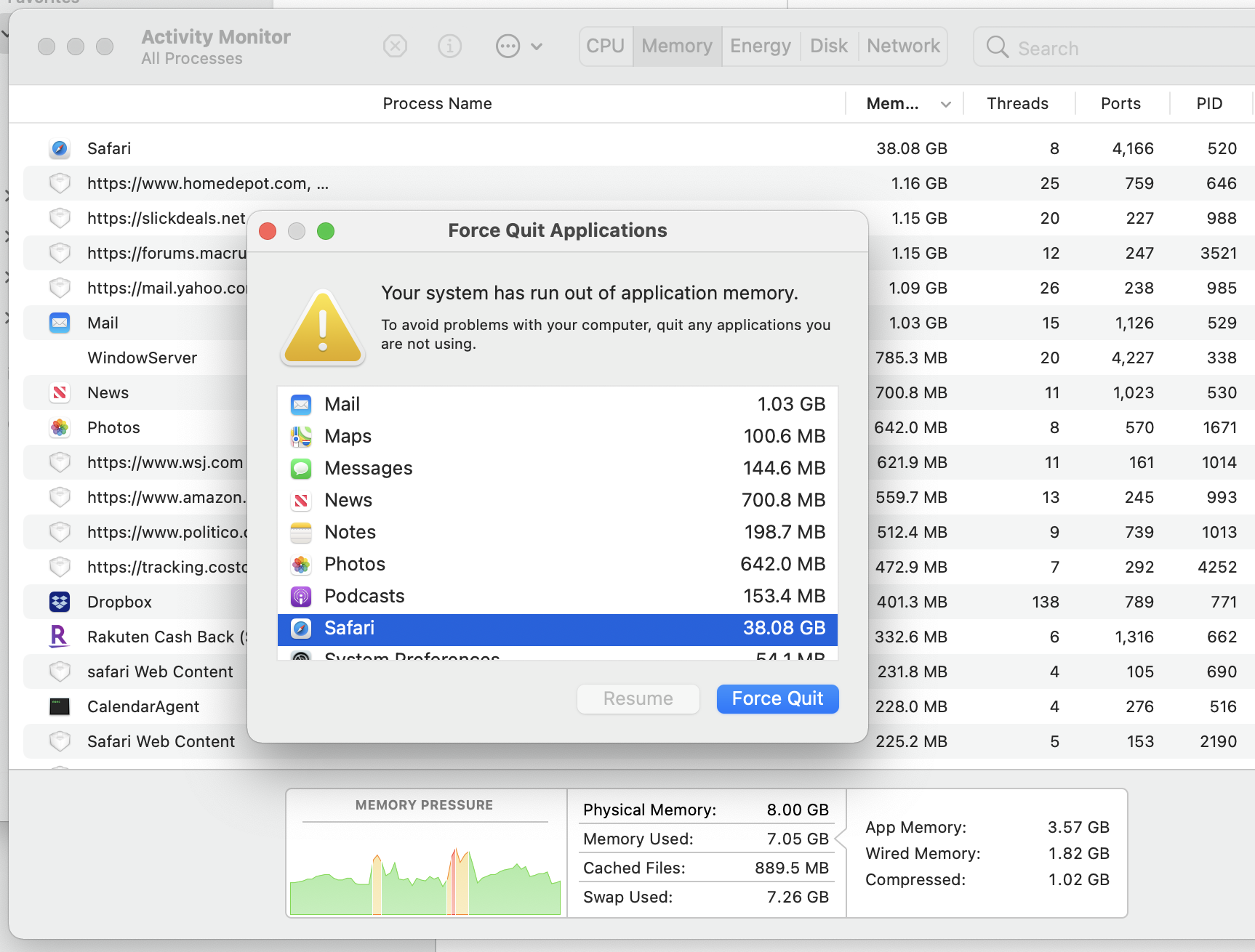 Why I say that it is because it is because Big Sur is running out of memory is because I have been monitoring the use of memory via Activity Monitor. What I have discovered that the Apple News app keeps taking up more and more memory over time. I don't think that that in itself should cause Big Sur to freeze because it should draw on virtual memory. However, the amount of virtual memory that is used seems to very very small. If I keep on closing down Apple News and re-opening it, then this doesn't happen. I haven't observed any other applications doing this but then I don't use a lot of different applications. …